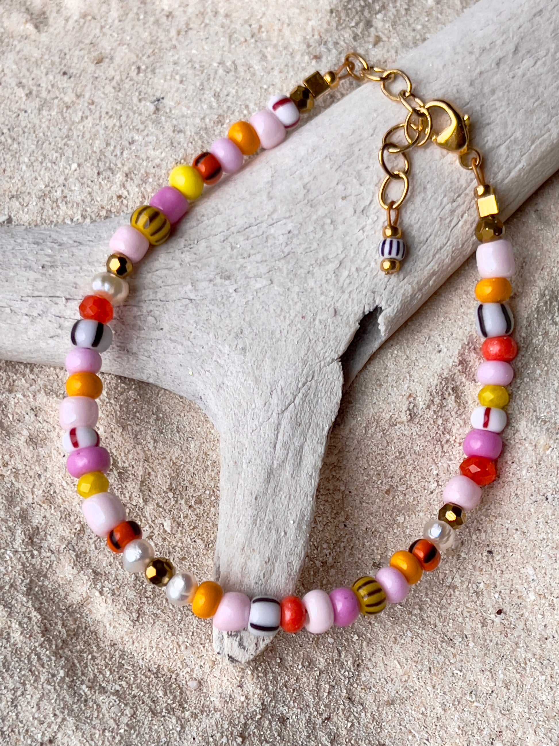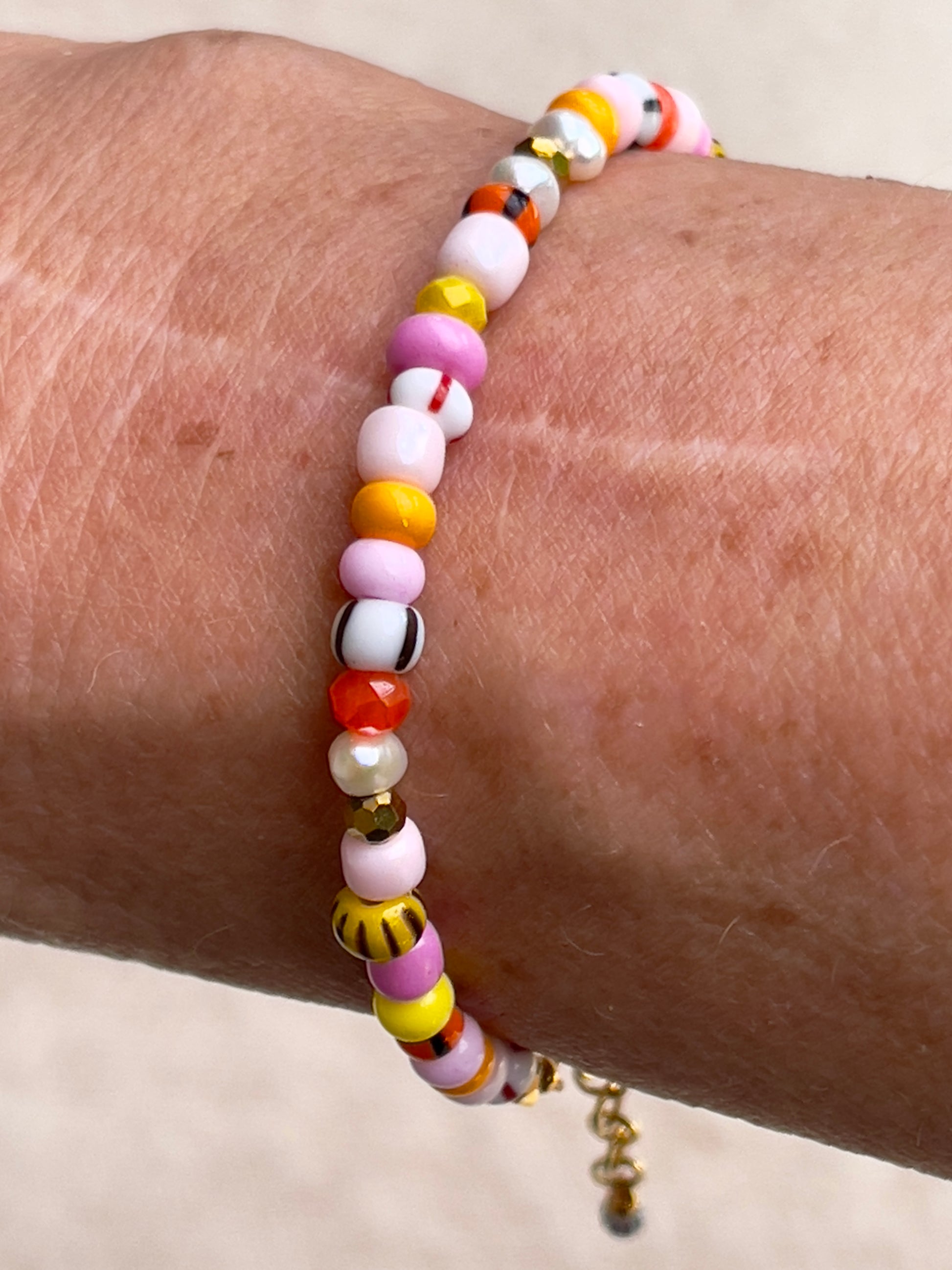 Armbåndet er lavet af store stribede og ensfarvede Seed Beads, gyldne glasperler og små ferskvandsperler. Farverne er orange, gul og rosa toner.
