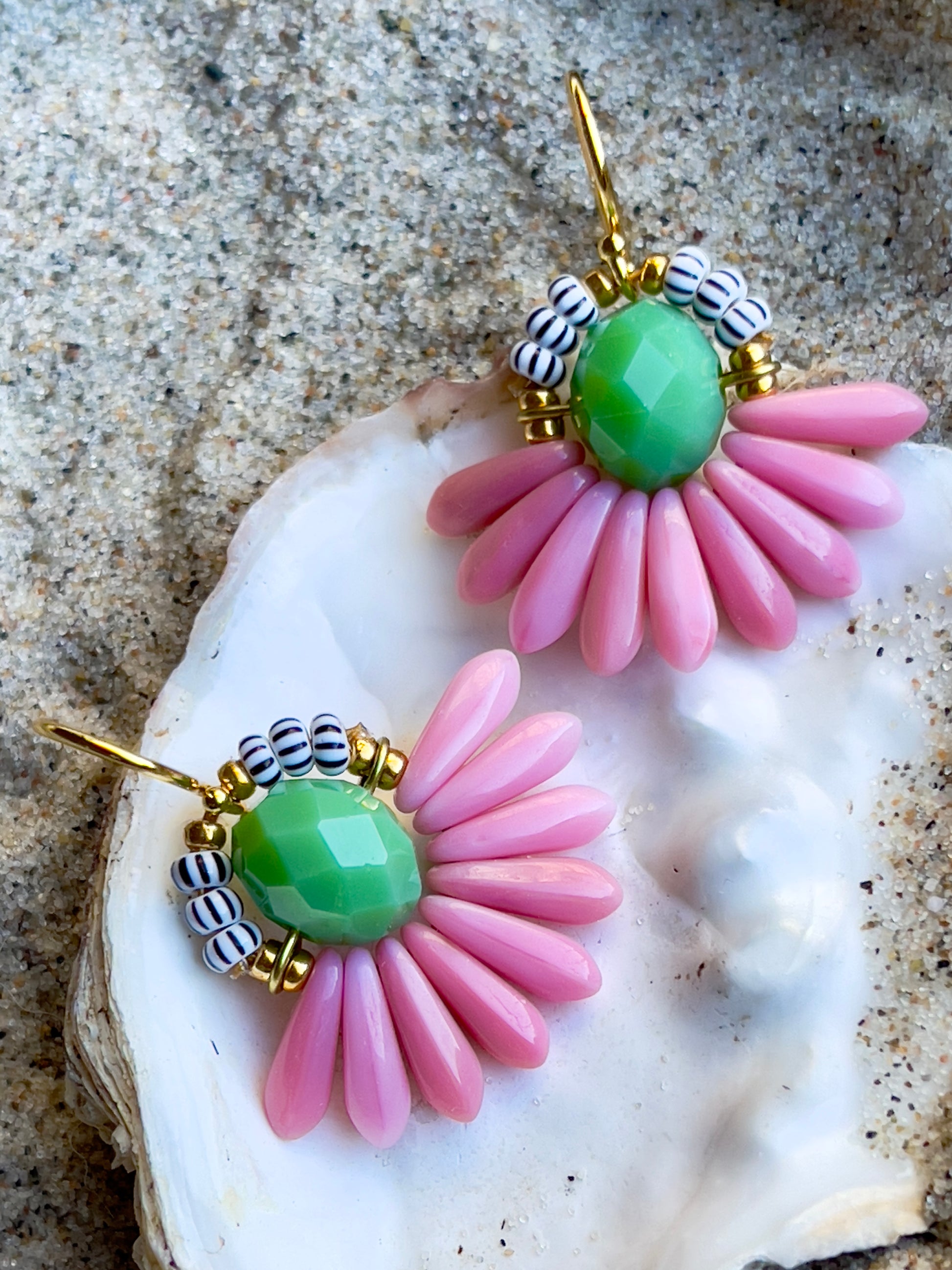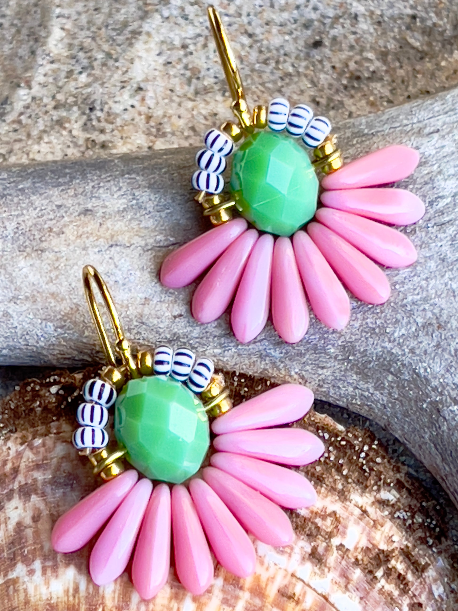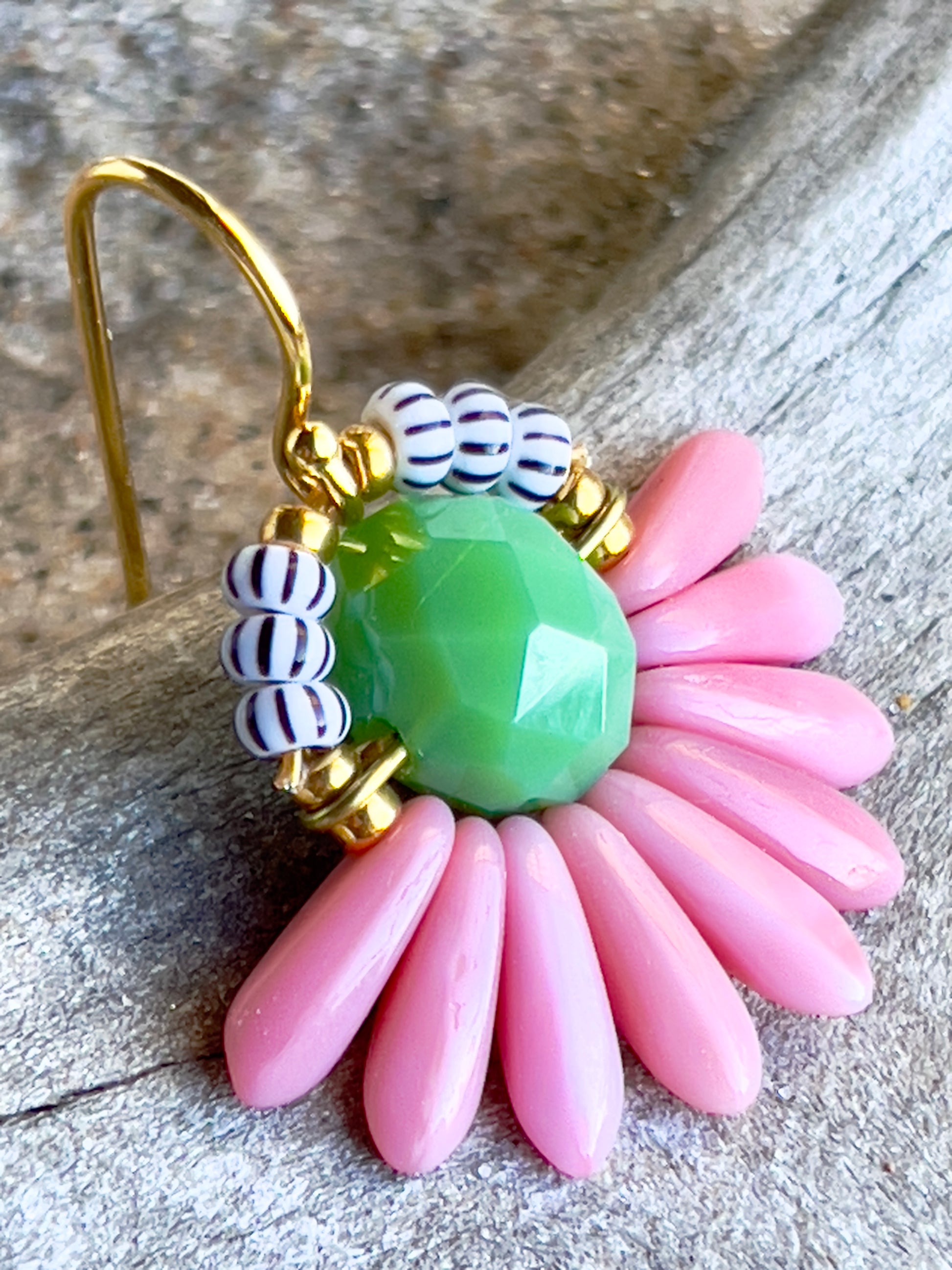 Lille blomster ørering i farverne rosa og grøn. Øreringen består af en flot grøn glasperle i midten med blade af rosa glasperler og stribede seed beads perler. Ørekrog af forgyldt sølv.