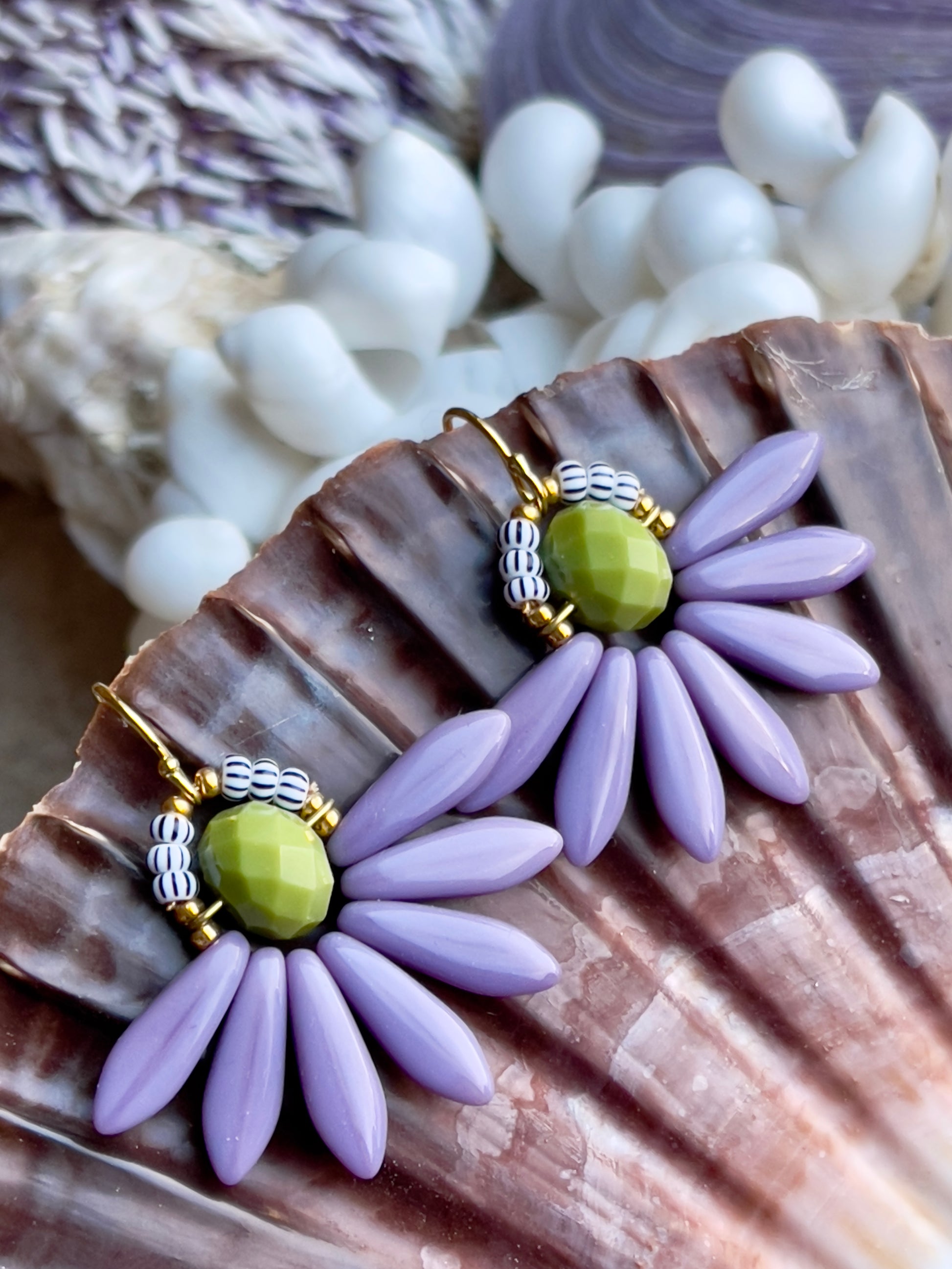 Stor blomster ørering med perle i farverne lys lilla og lyse grøn. Øreringen består af en flot lys grøn glasperle i midten med blade af tjekkiske lys lilla glasperler og stribede seed beads. Ørekrog af forgyldt sølv.