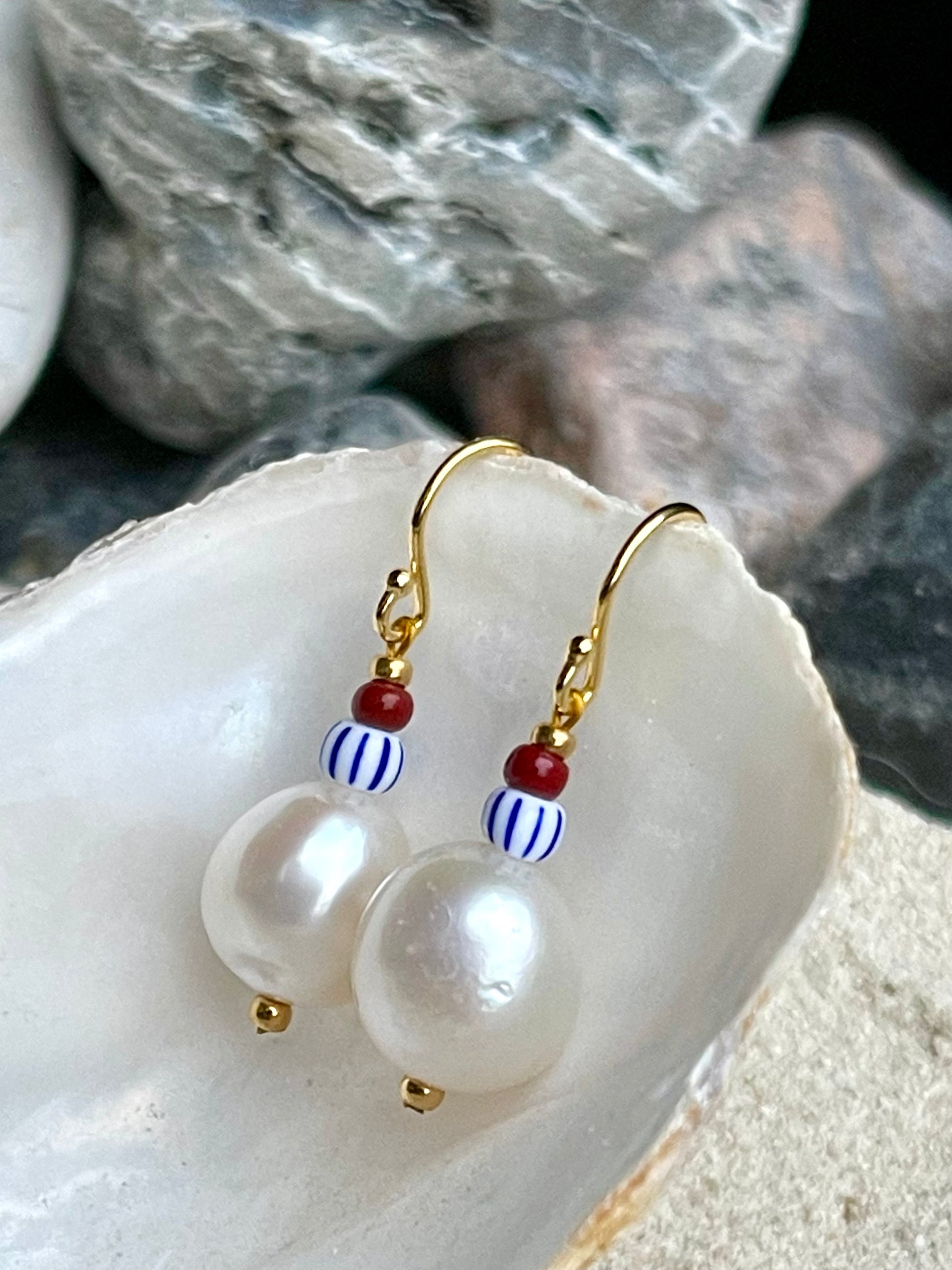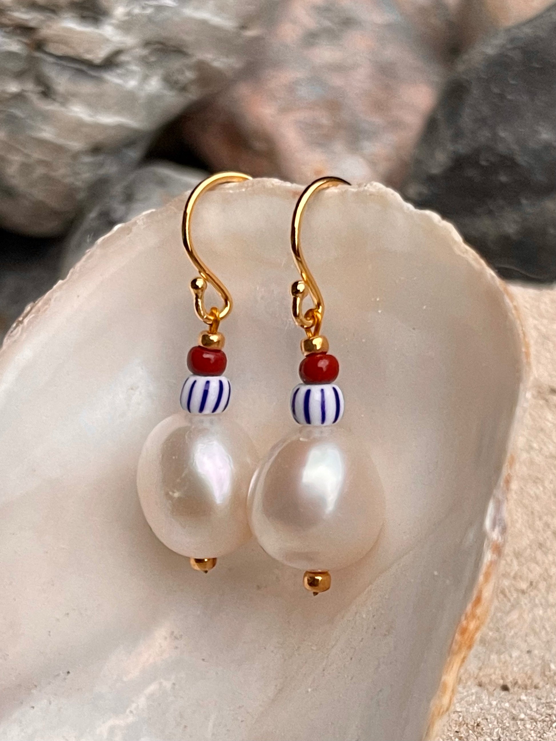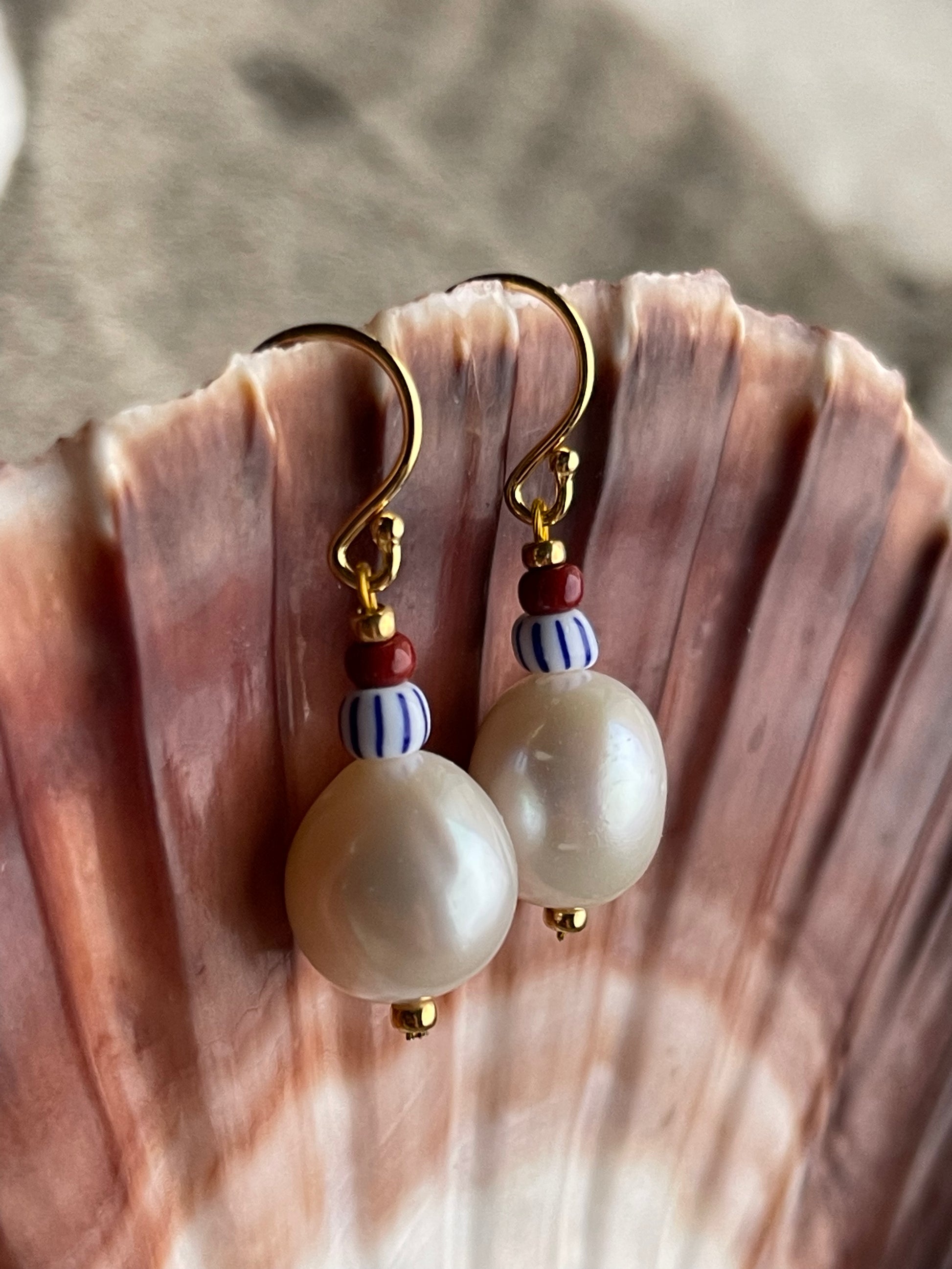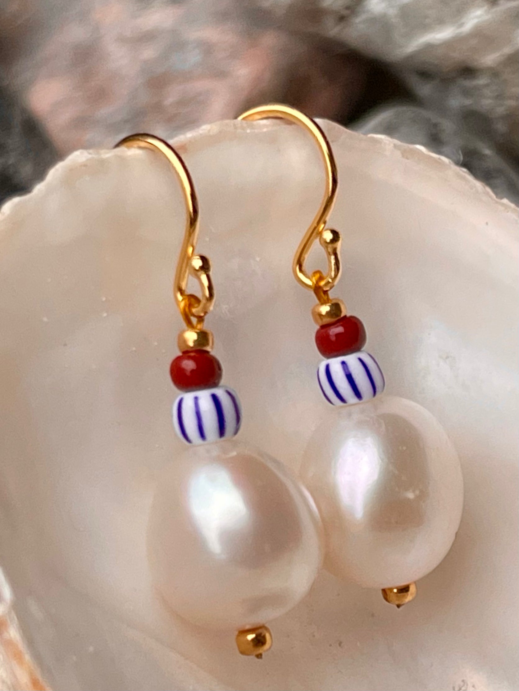Ørering med stor ferskvandsperle, stor blå og hvid stribet seed bead samt brun seed bead. Ørekrog af forgyldt sølv.