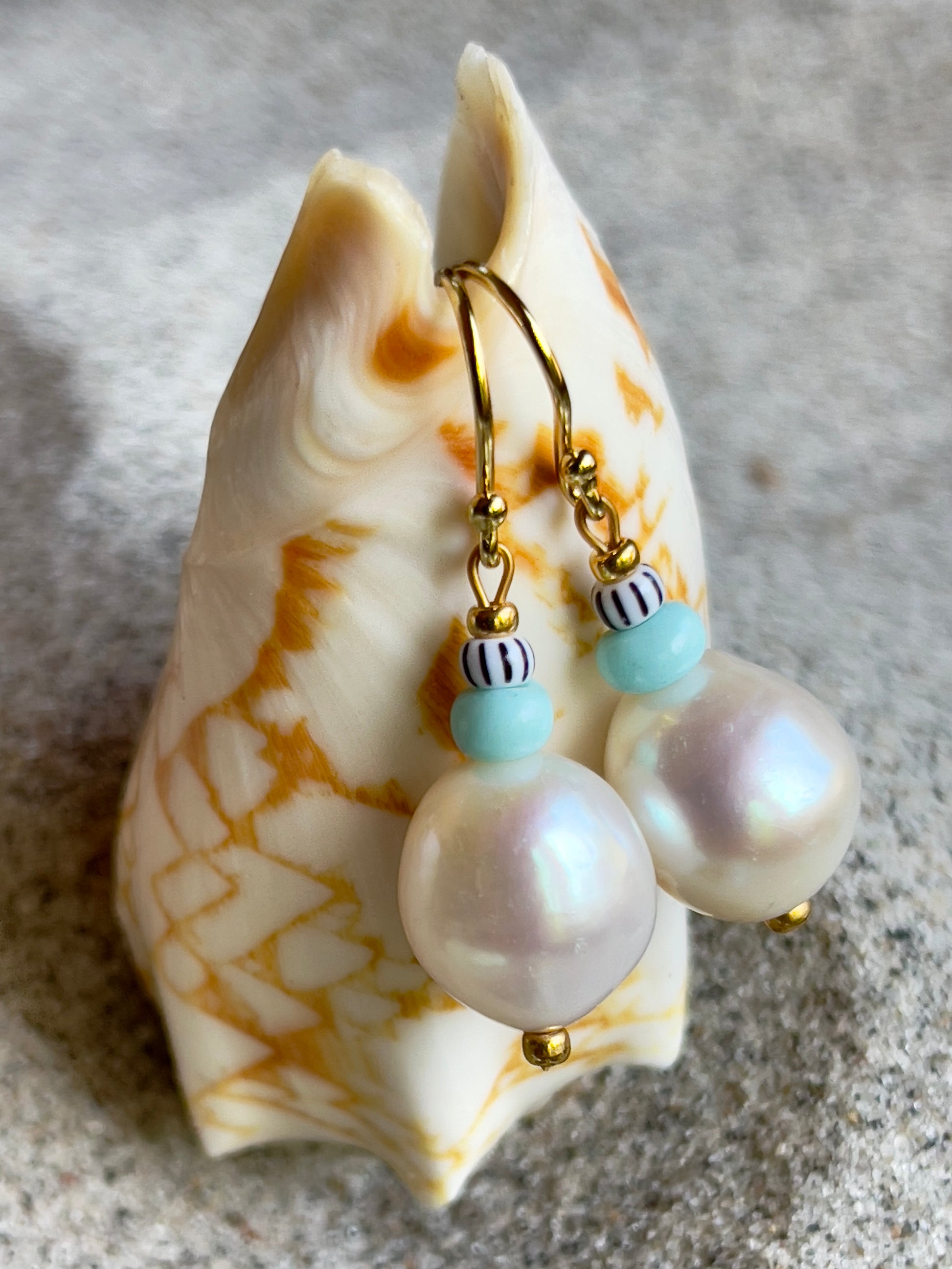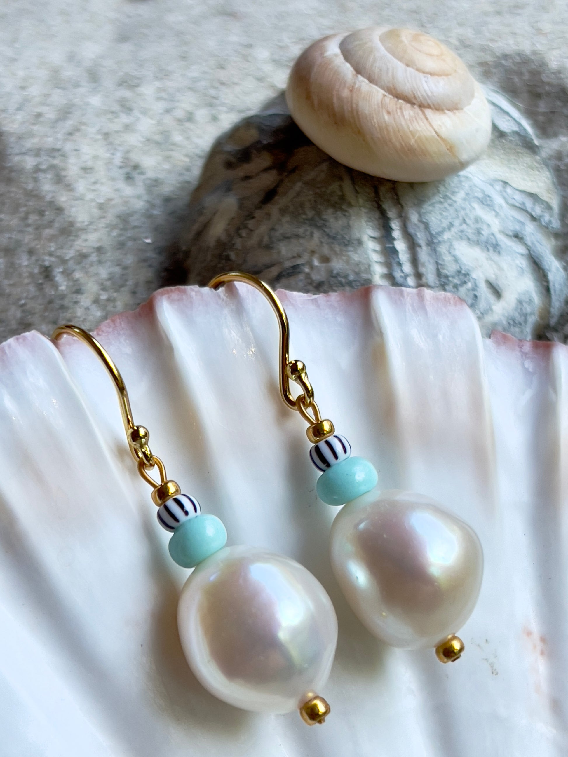 Ørering med stor flot ferskvandsperle, stor lyseblå seed bead samt lille sort og hvid stribet seed bead. Ørekrog af forgyldt sølv.