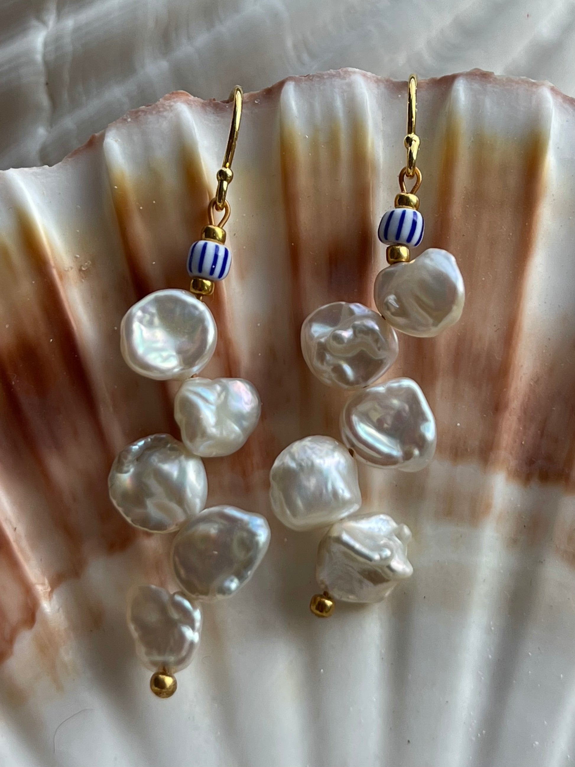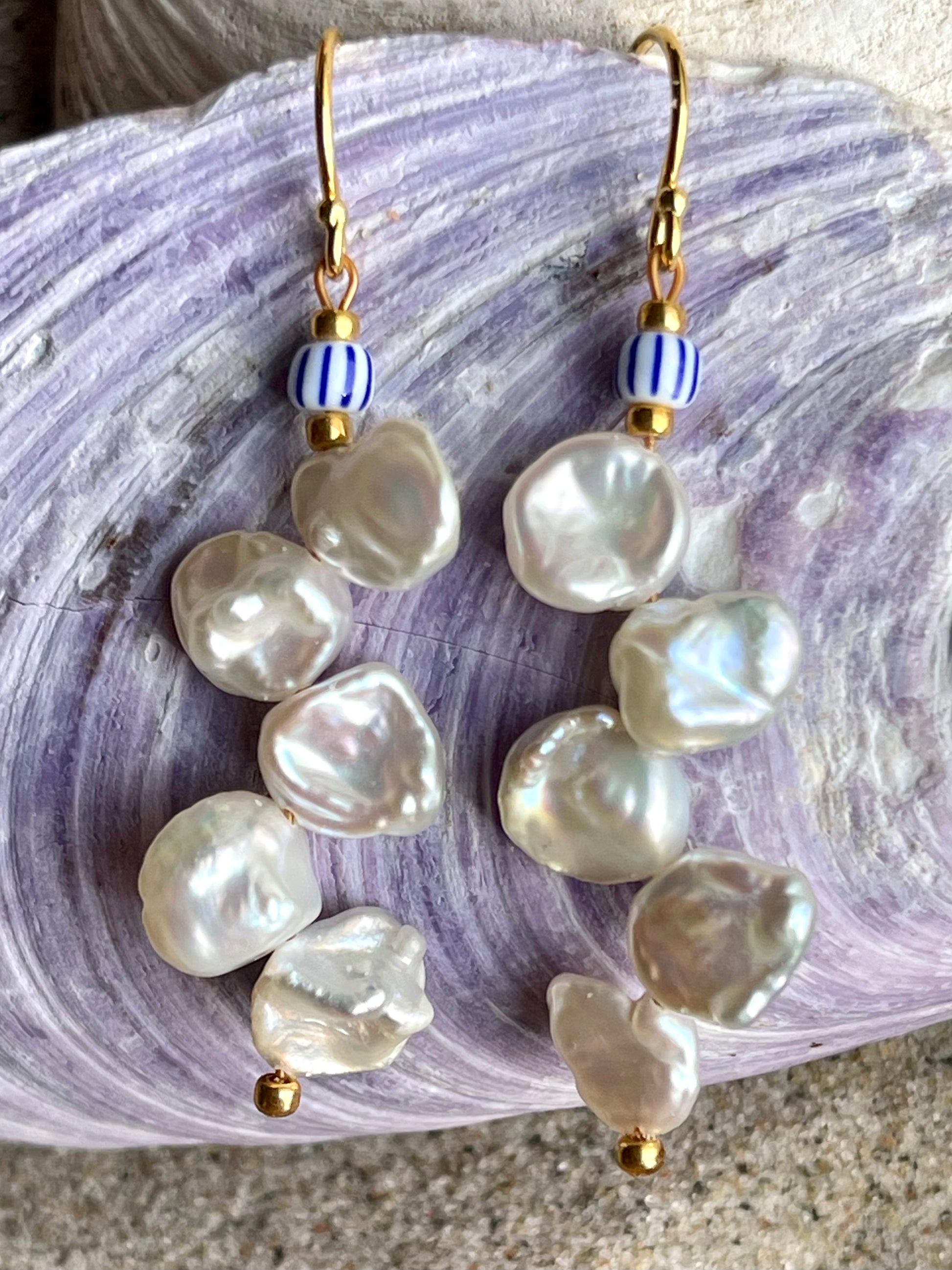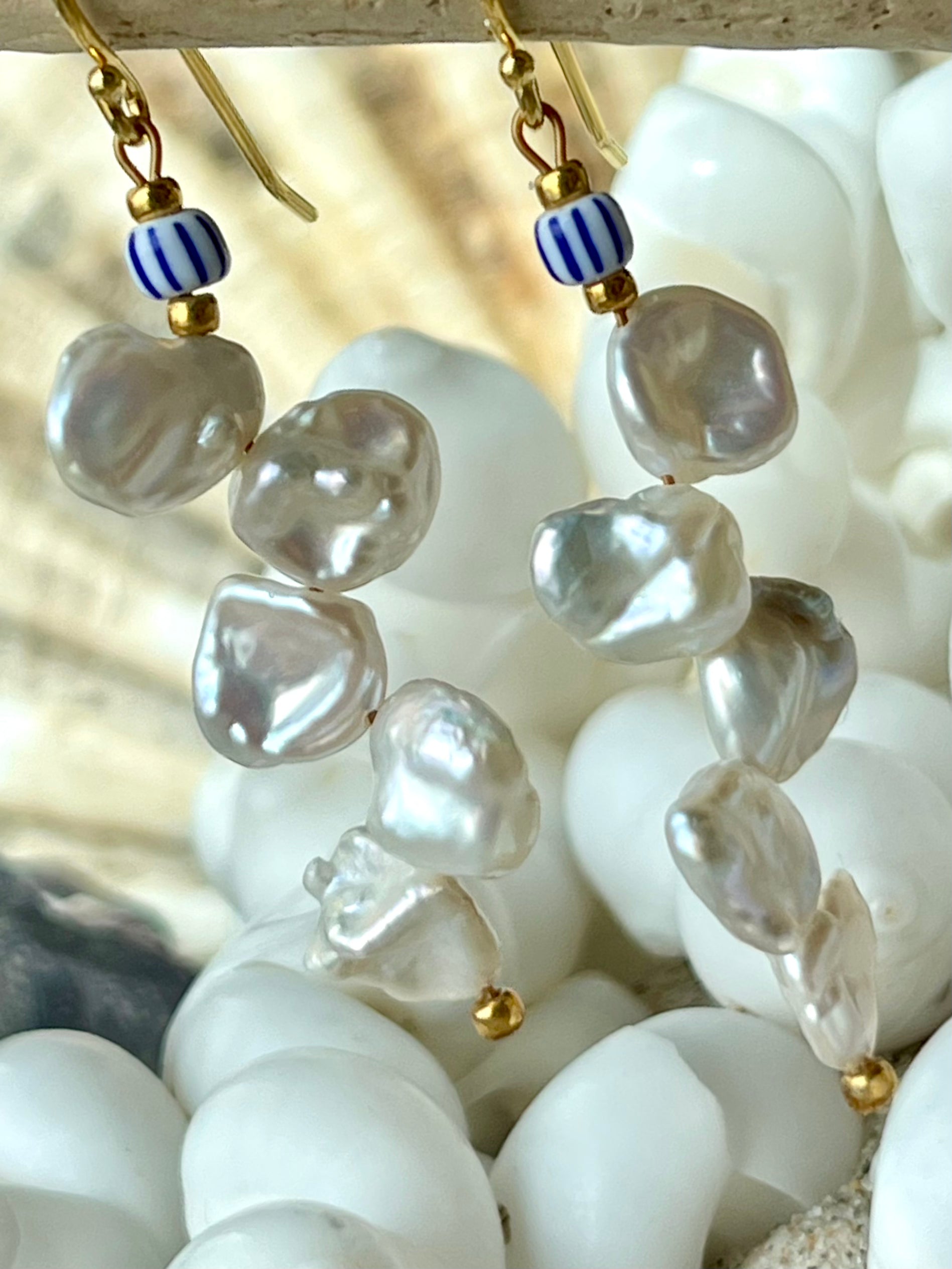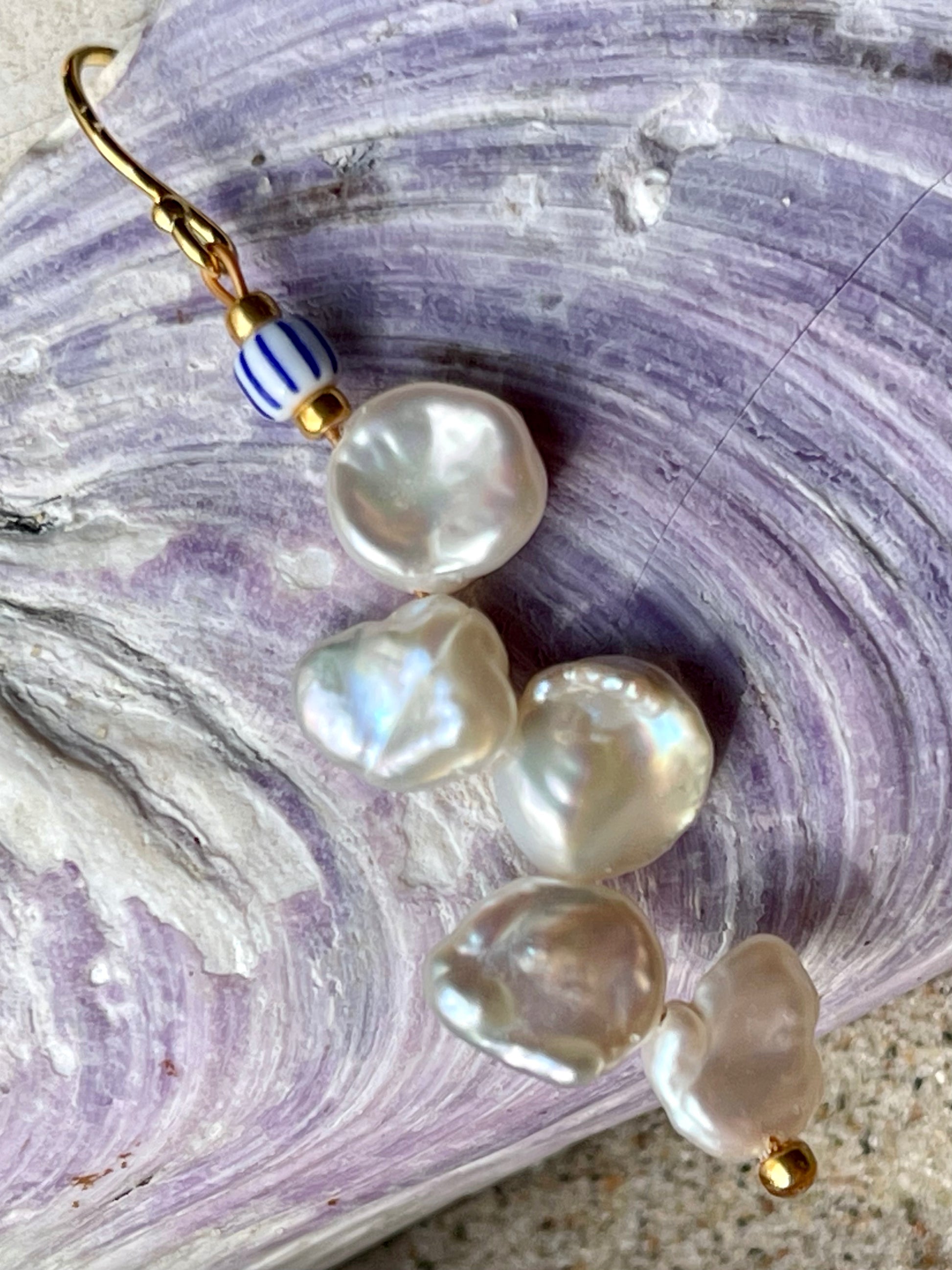Ørering med fem flotte ferskvandsperler hængende fra ørekrog af forgyldt sølv, samt en stribet seed bead. Hele øreringen måler ca. 5 cm.