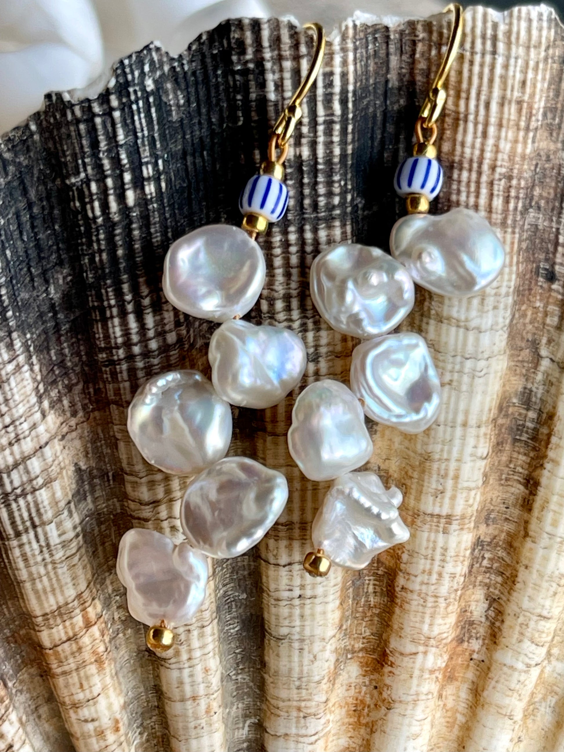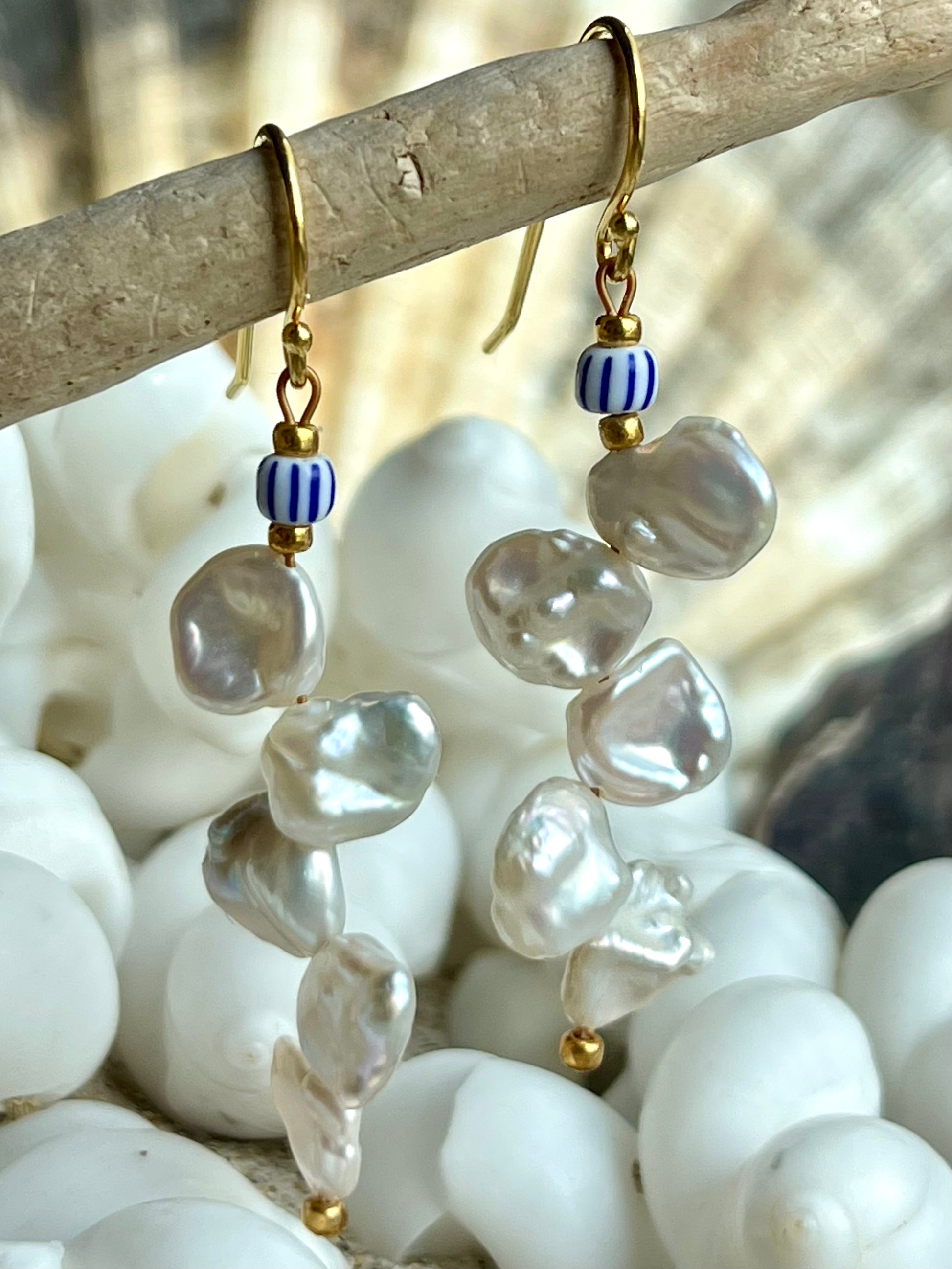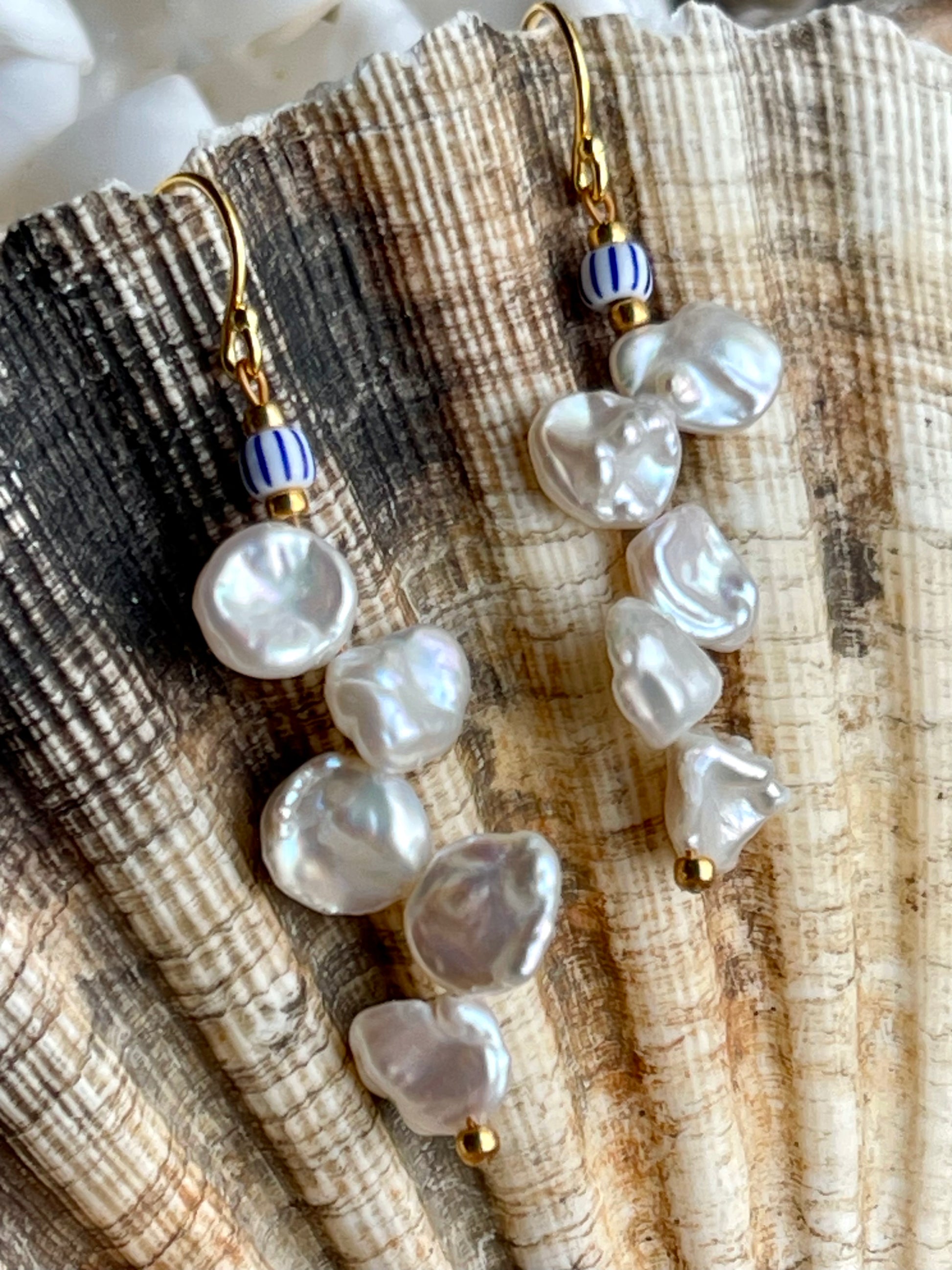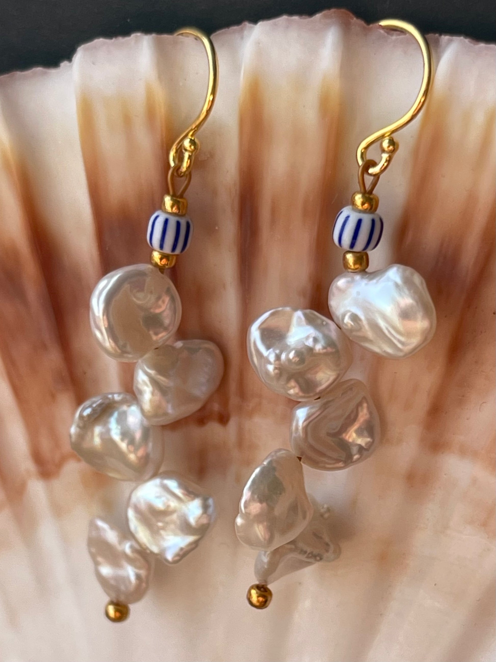 Ørering med fem flotte ferskvandsperler hængende fra ørekrog af forgyldt sølv, samt en stribet seed bead. Hele øreringen måler ca. 5 cm.