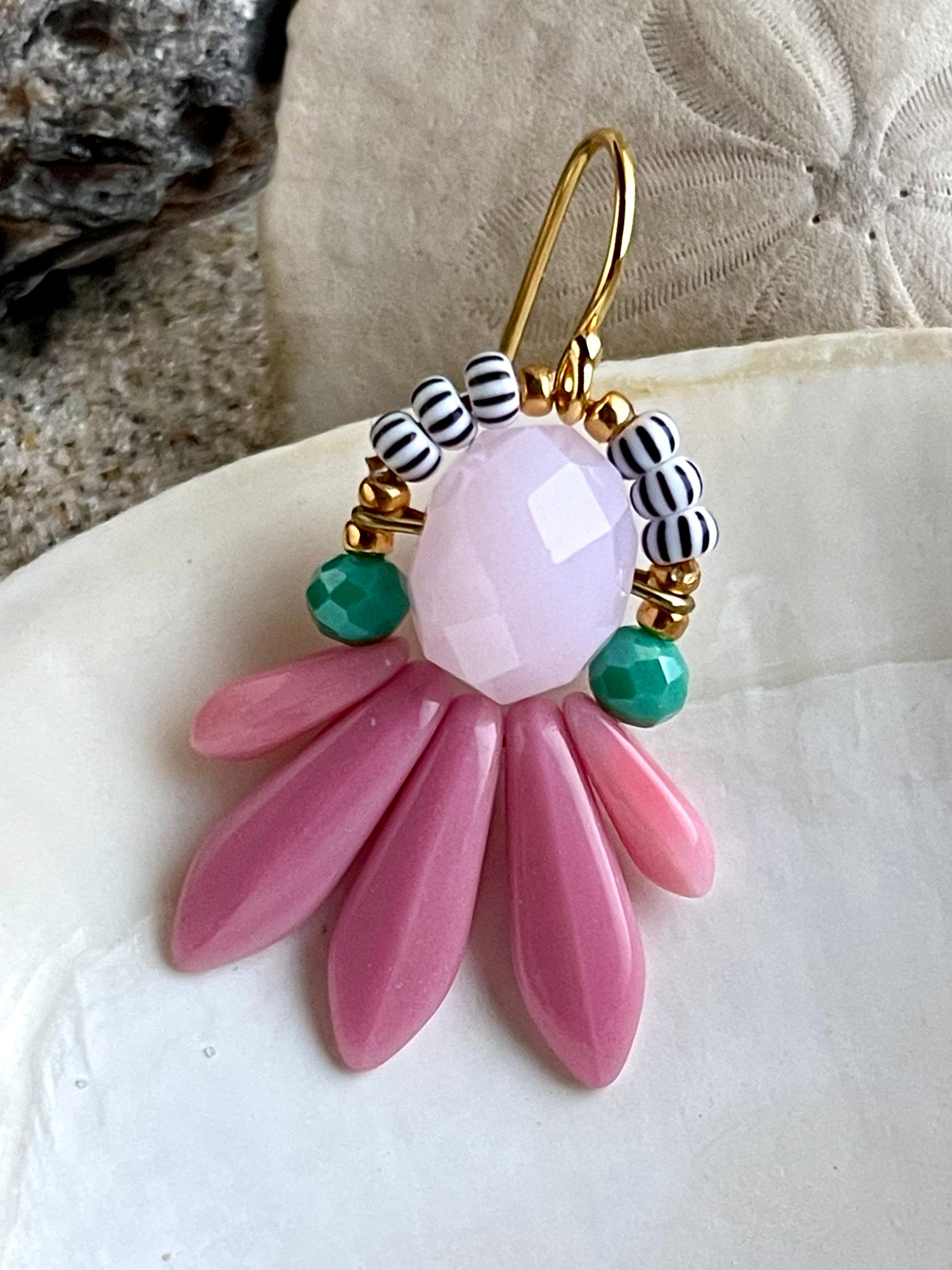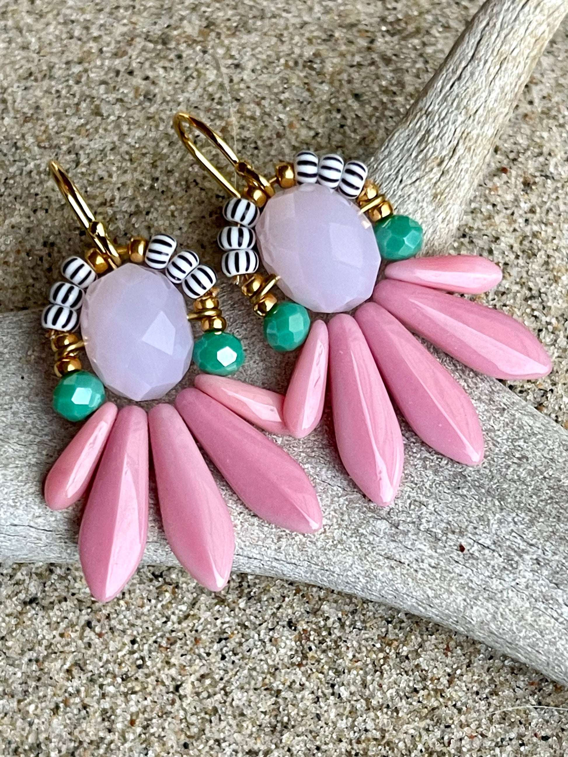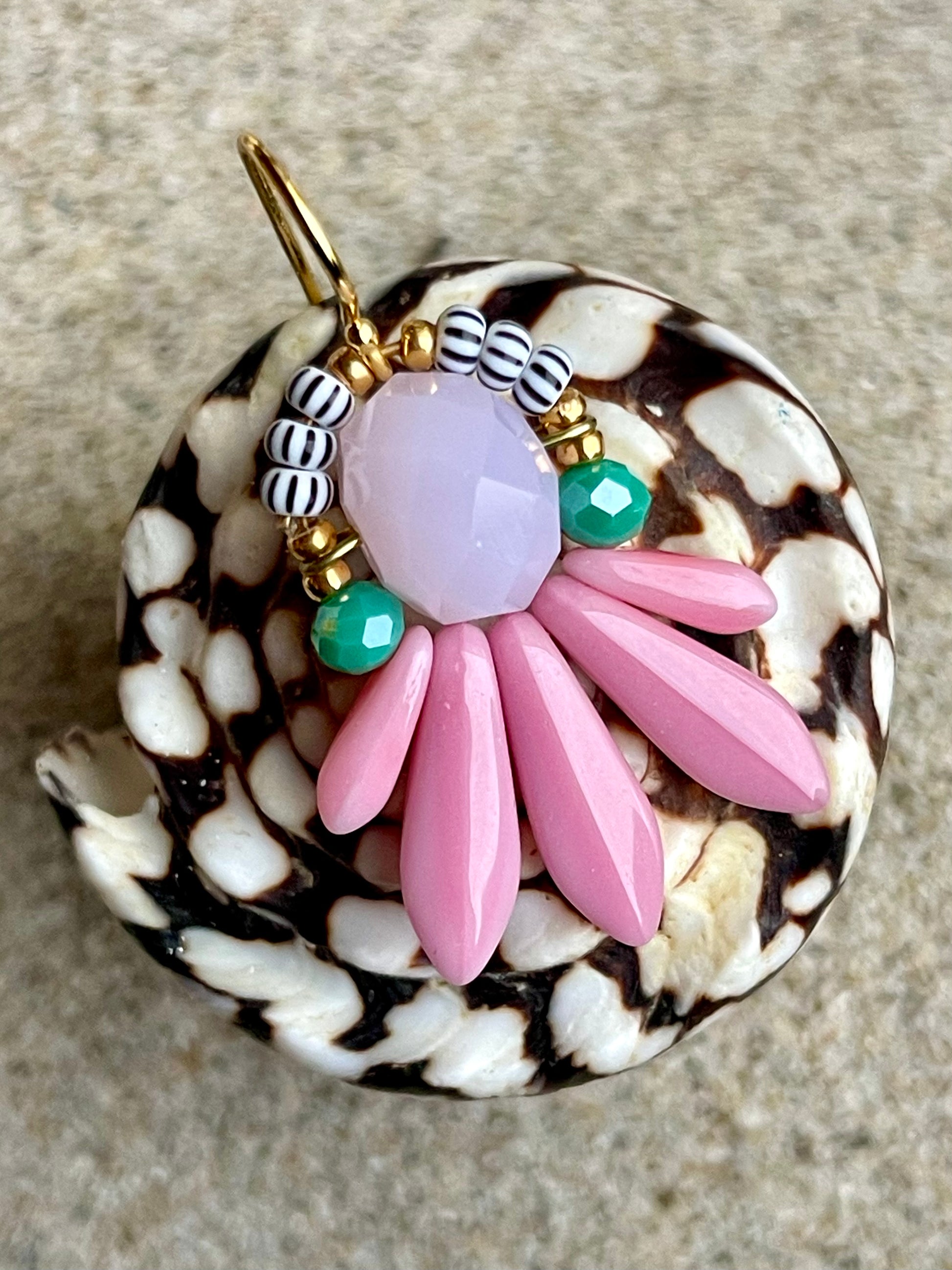 Stor ørering i farverne rosa, grøn og lyserød. Øreringen består af en rosa glasperle i midten, to små grønne glasperler og blade af flotte specielle lyserøde glasperler. Stribede seed beads og ørekrog af forgyldt sølv.