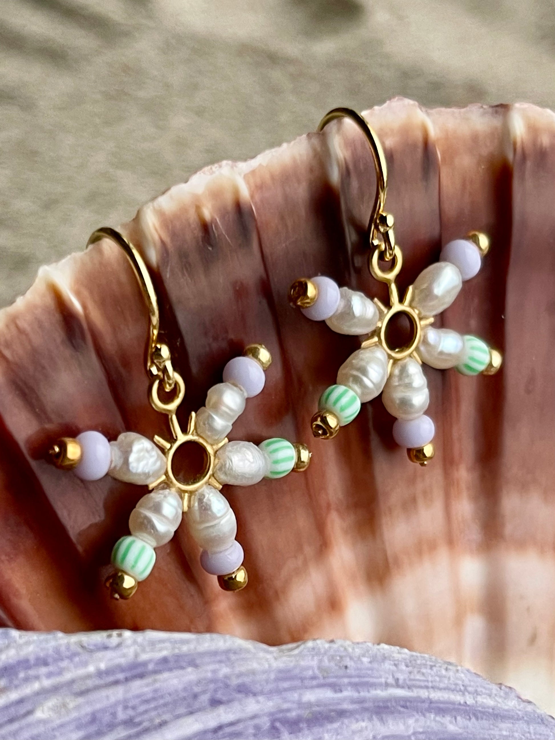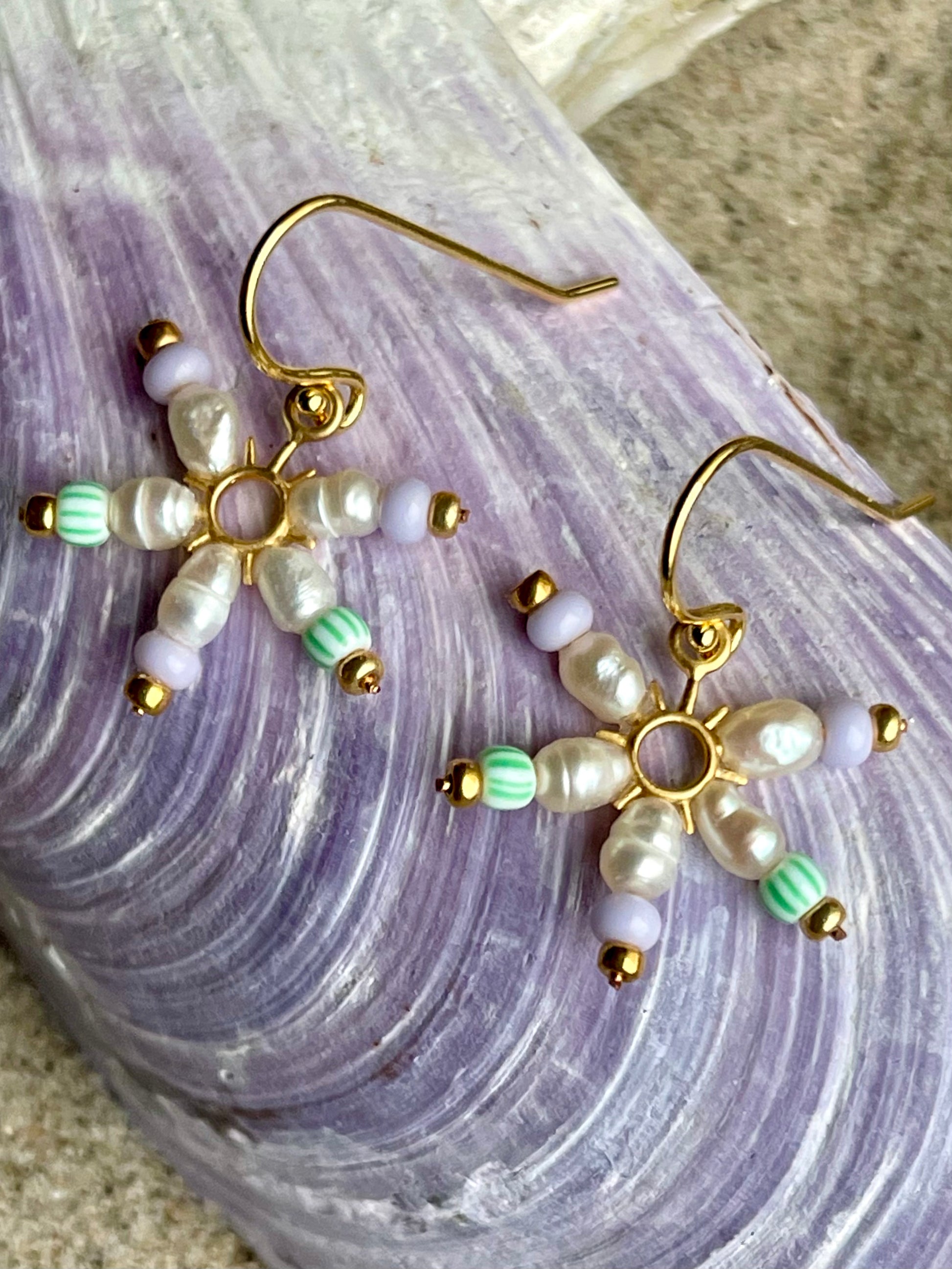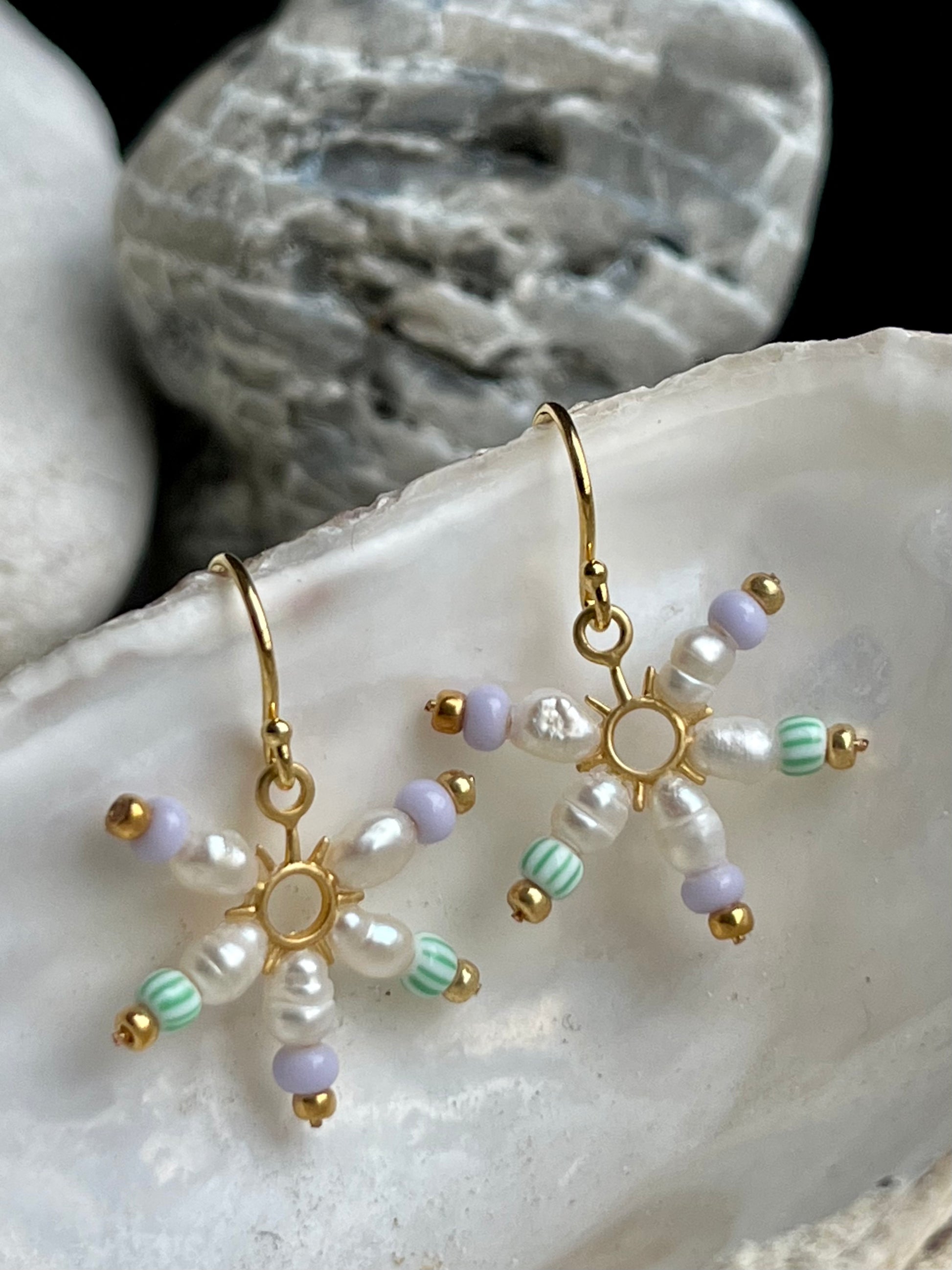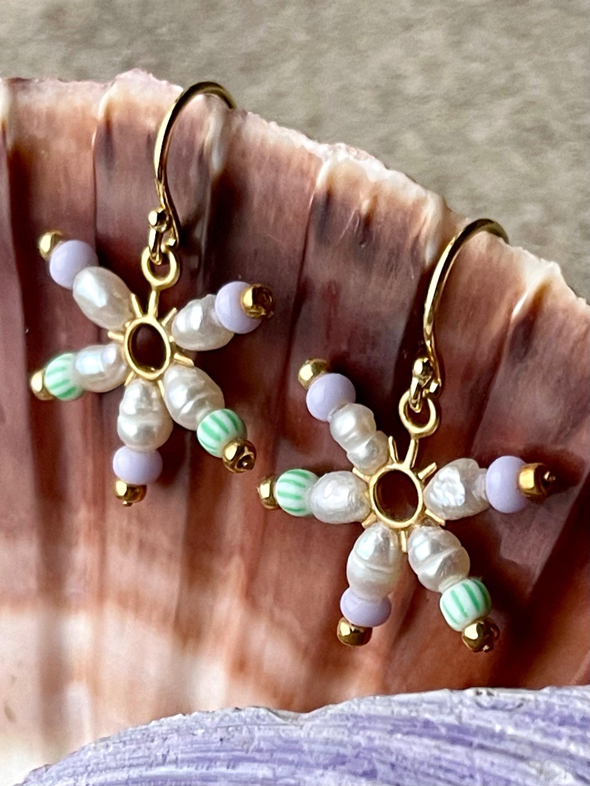 Fin lille stjerne ørering af små ferskvandsperler og lysegrøn og lyselilla seed beads. Ørekrog af forgyldt sølv.