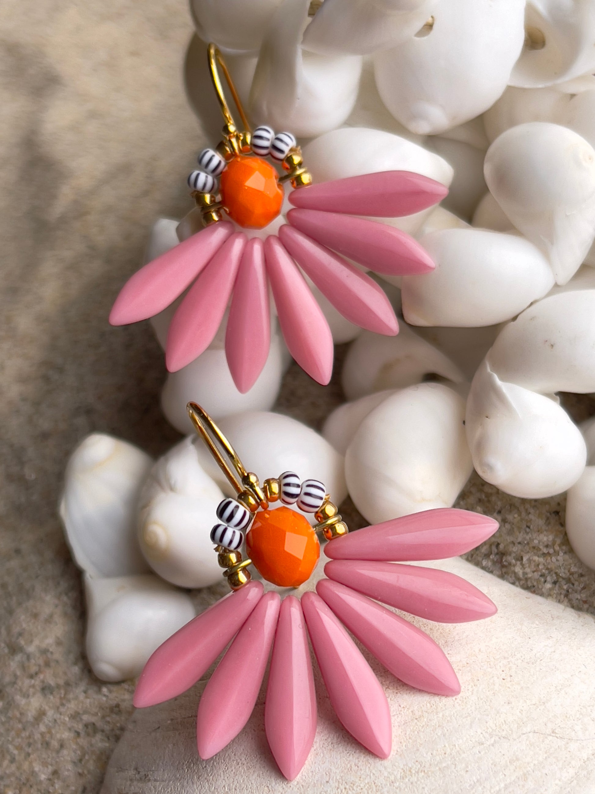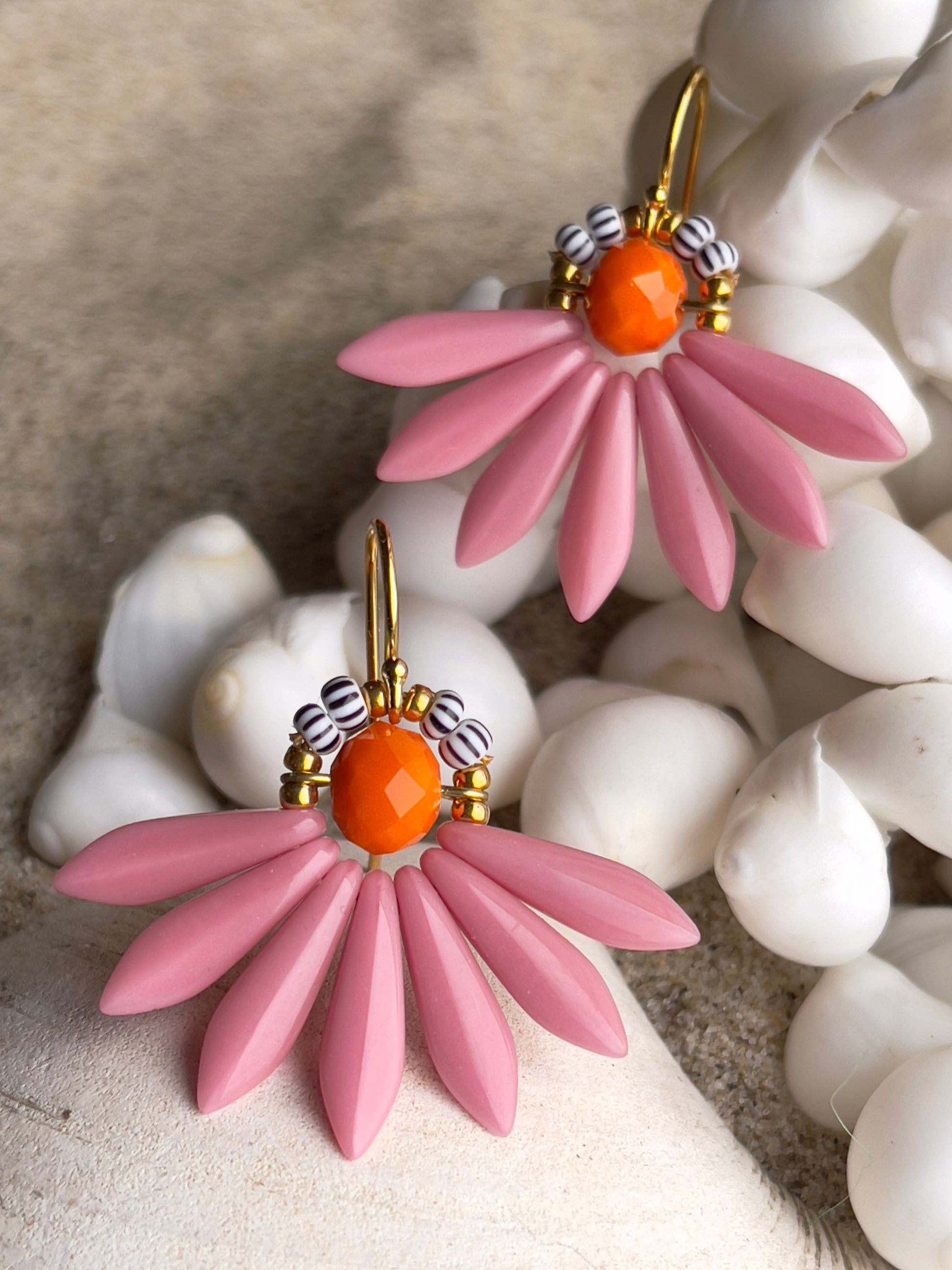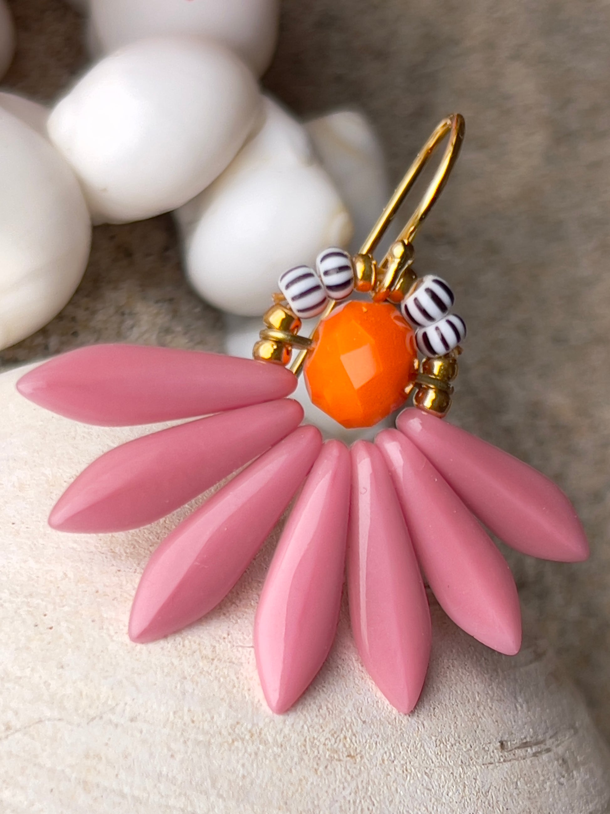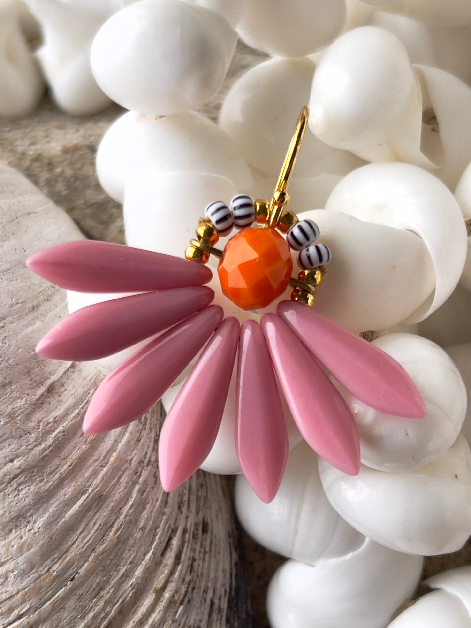 Stor blomster ørering i farverne rosa og orange. Øreringen består af en orange glasperle i midten med blade af flotte sjældne rosa glasperler og stribede seed beads. Ørekrog af forgyldt sølv.