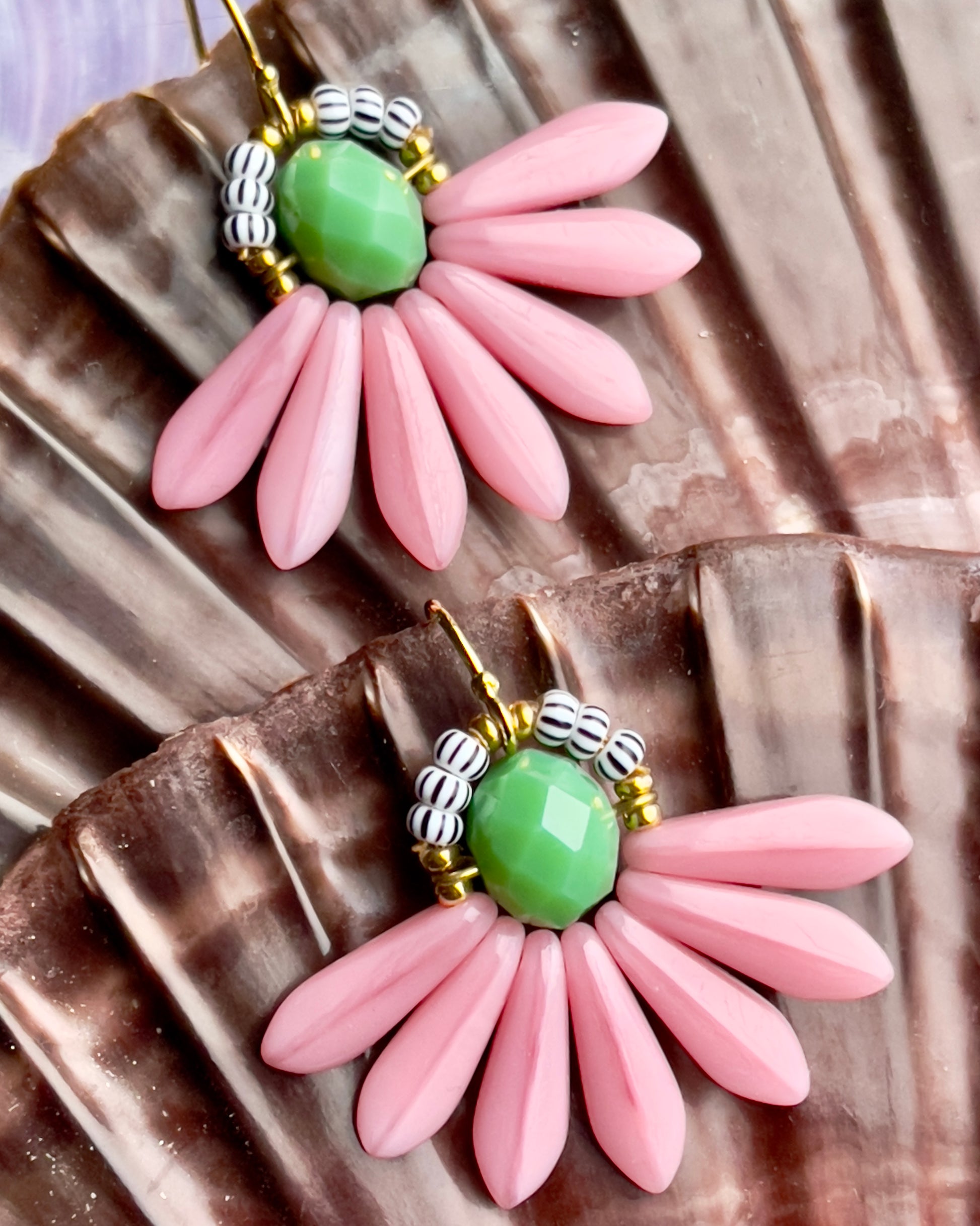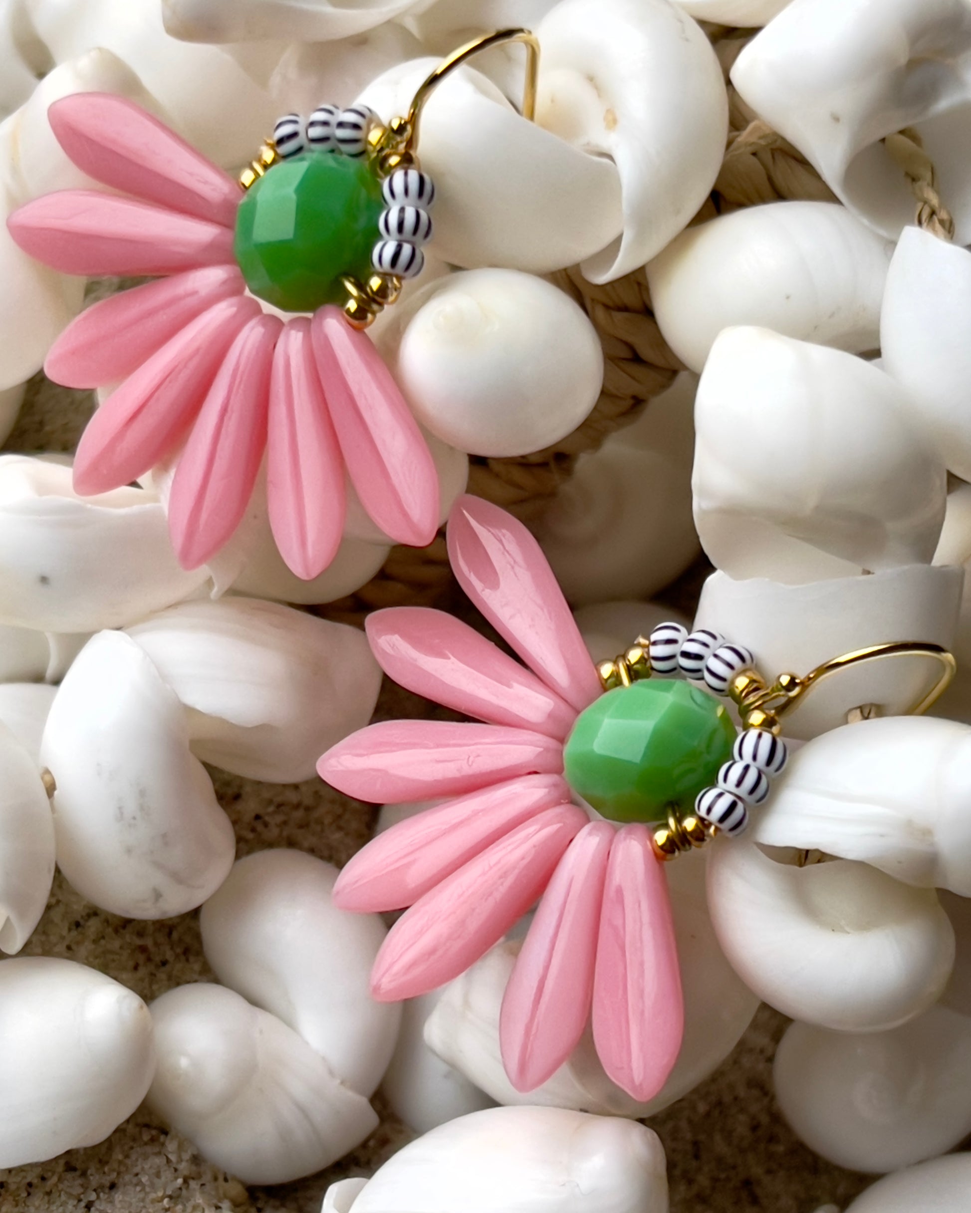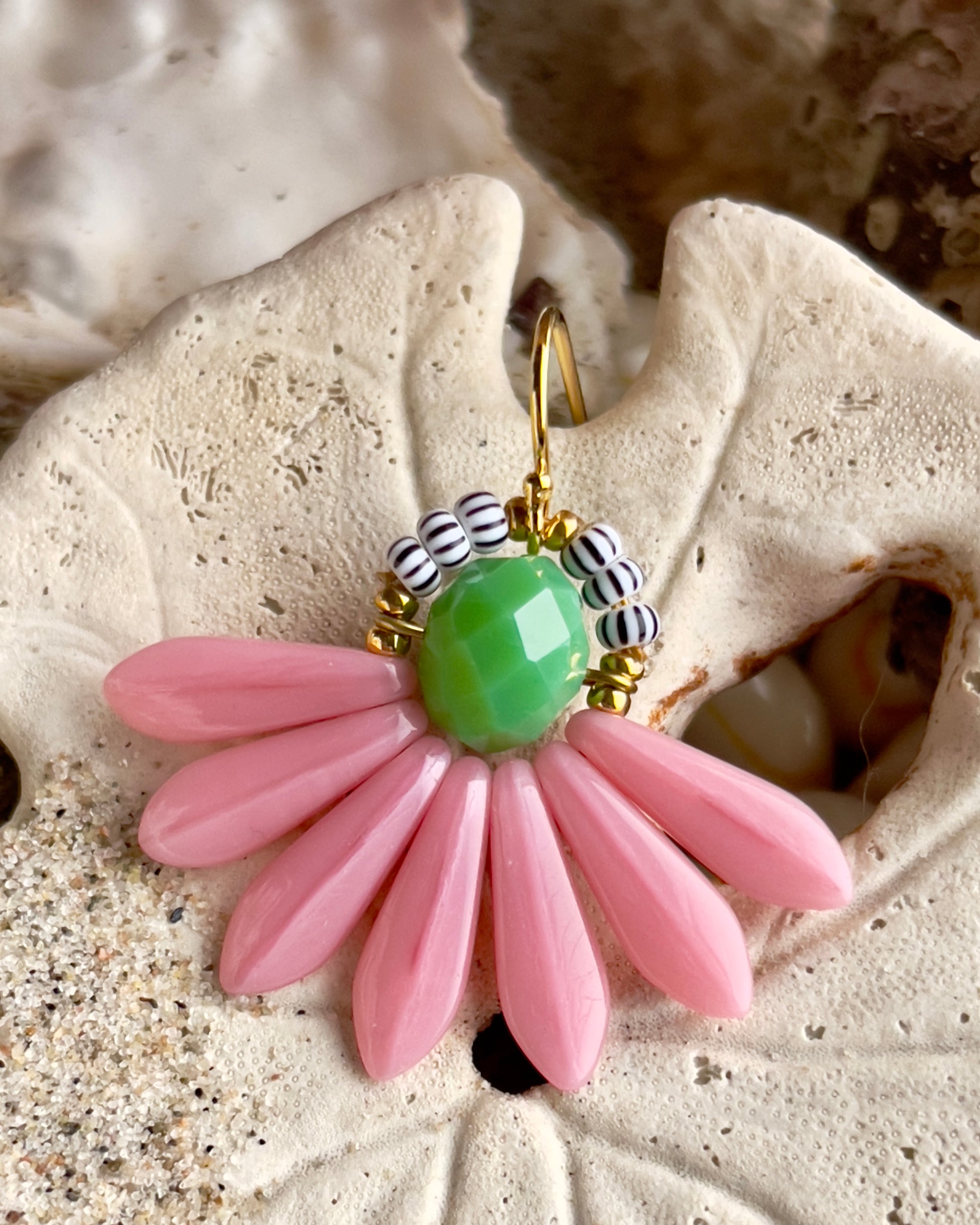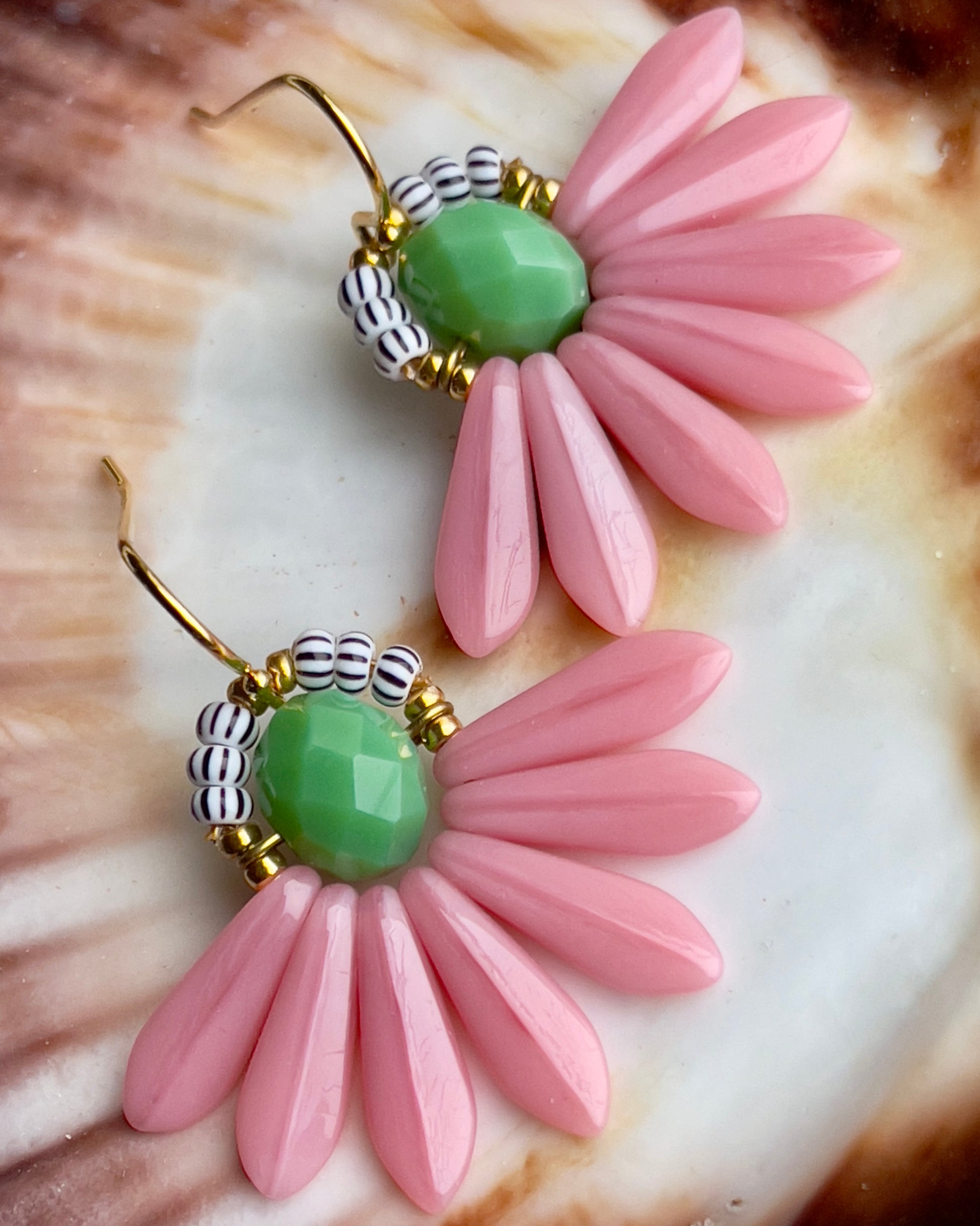 Stor blomster ørering med perle i farverne lyserød og grøn. Øreringen består af en flot grøn glasperle i midten med blade af sjældne tjekkiske lyserøde glasperler og stribede seed beads. Ørekrog af forgyldt sølv.
