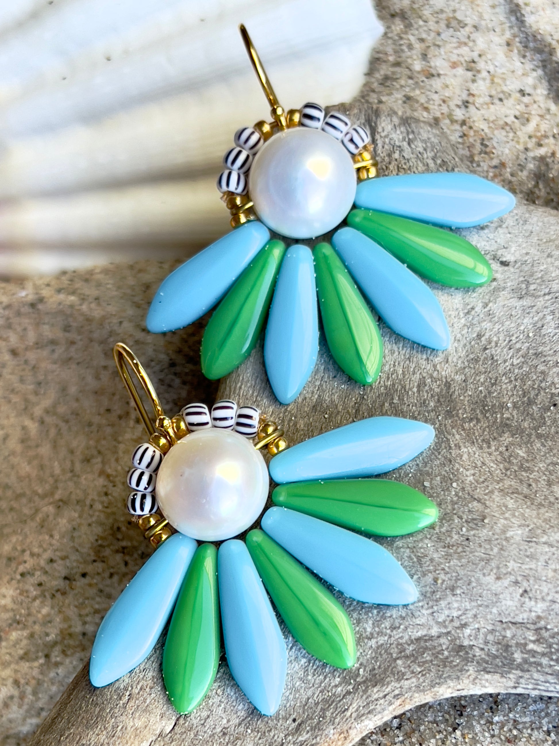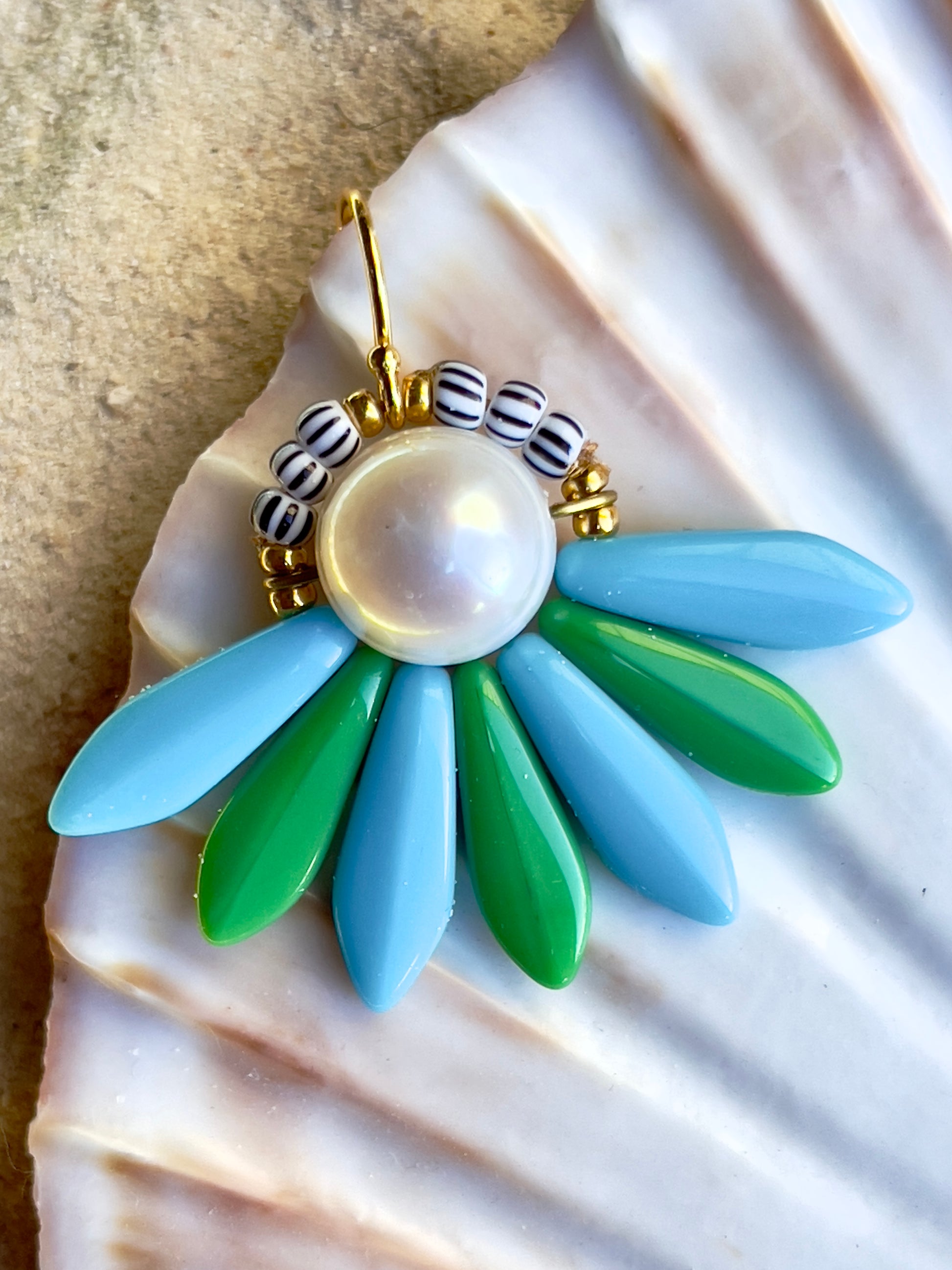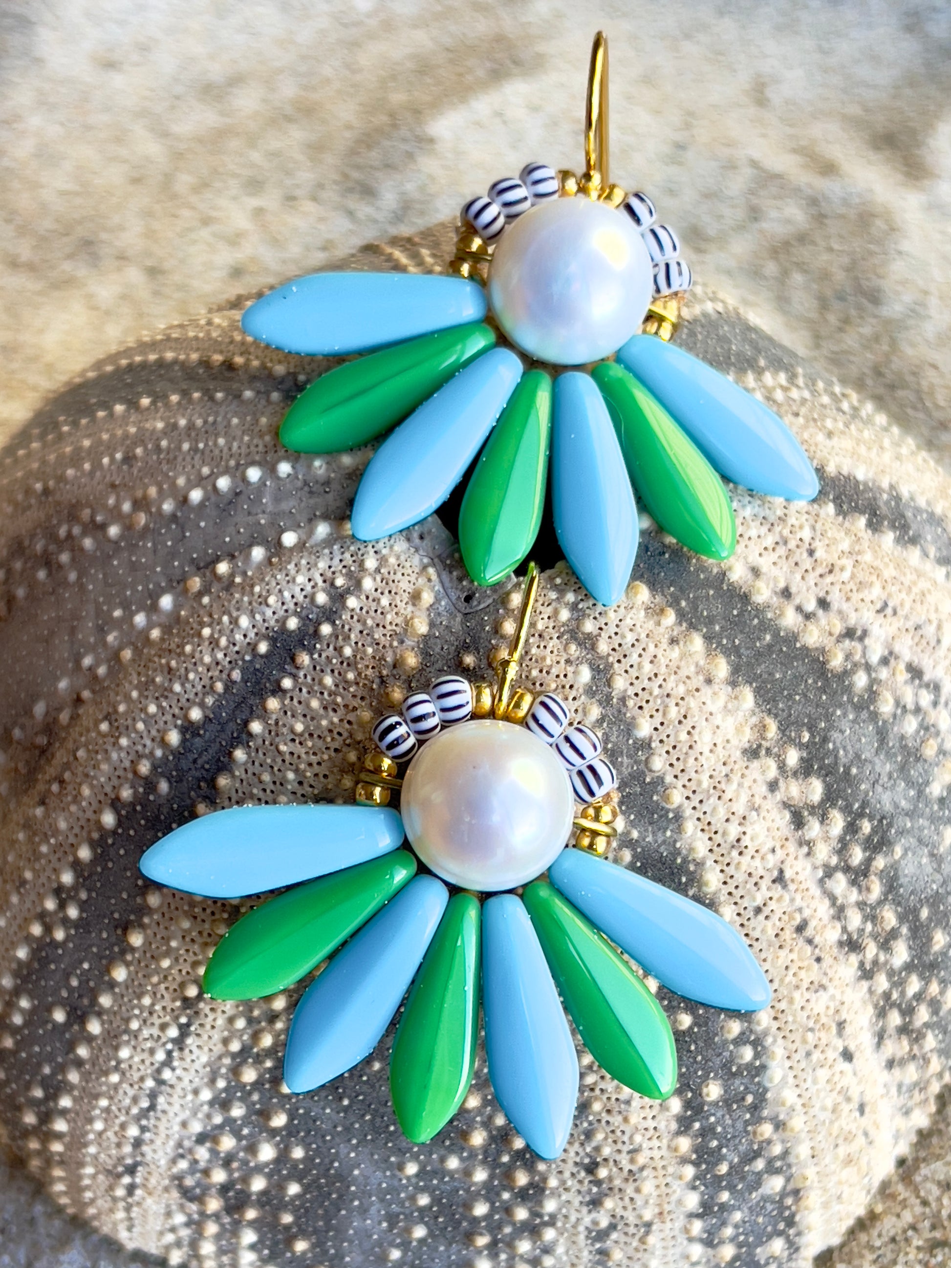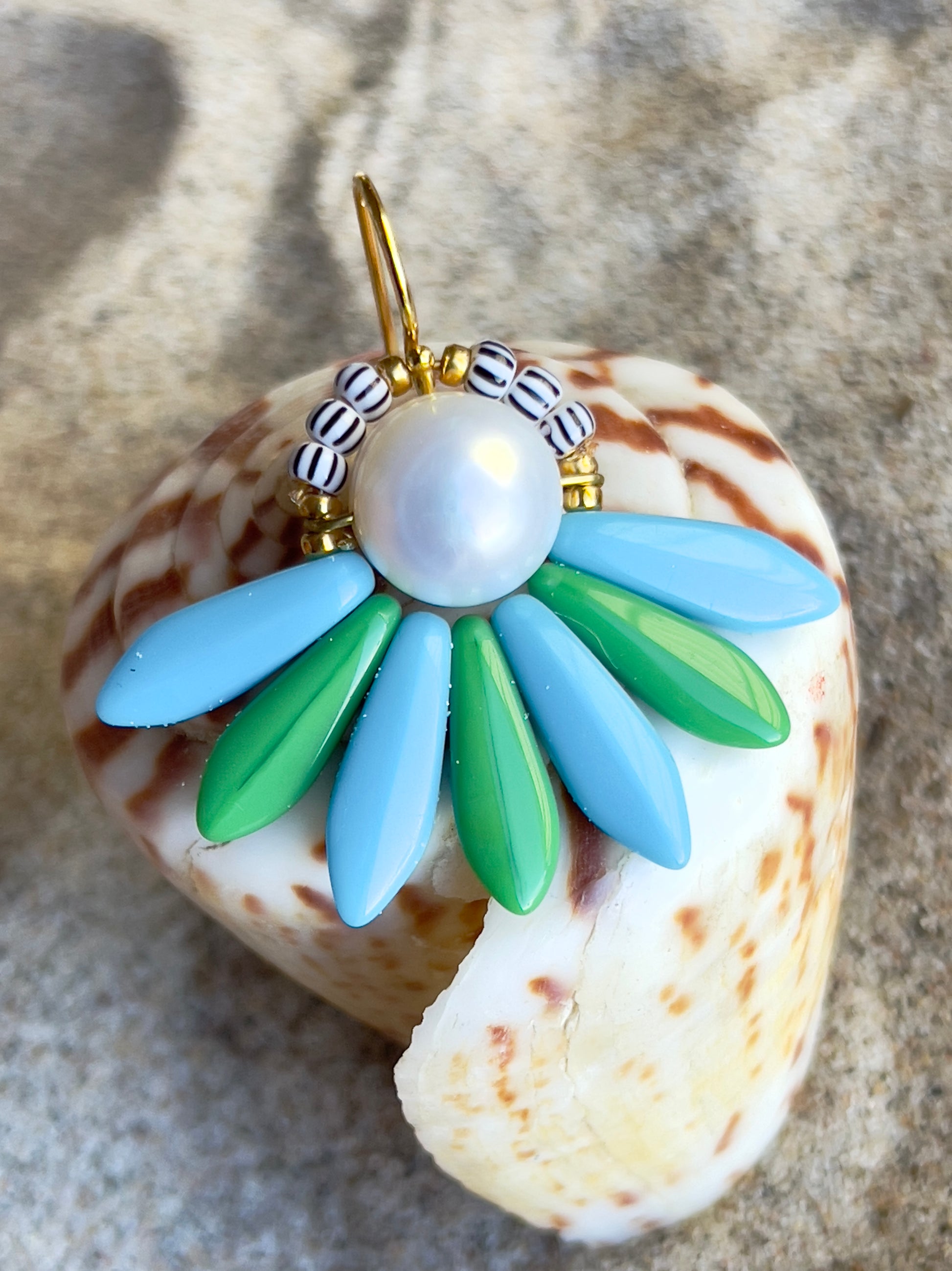 Stor blomsterørering med perle i farverne grøn og lyseblå. Øreringen består af en flot ferskvandsperle i midten med blade af tjekkiske grønne og lyseblå glasperler og stribede seed beads perler. Ørekrog af forgyldt sølv.