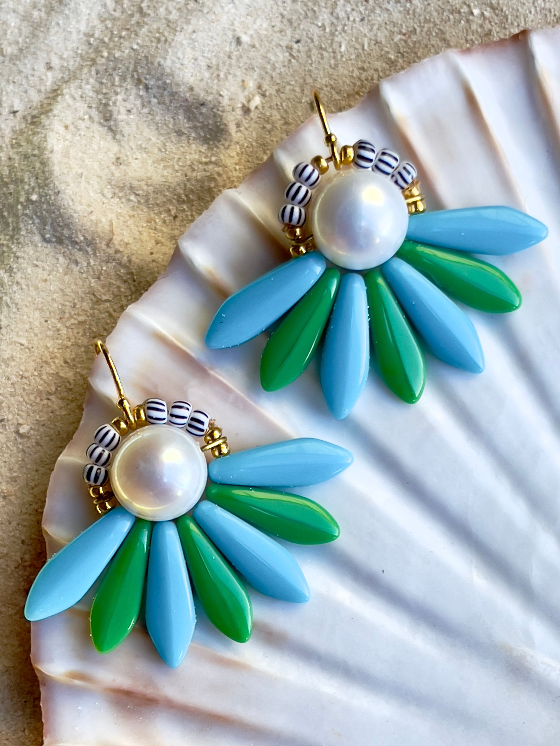 Stor lyseblå og grøn blomster ørering med ferskvandsperle