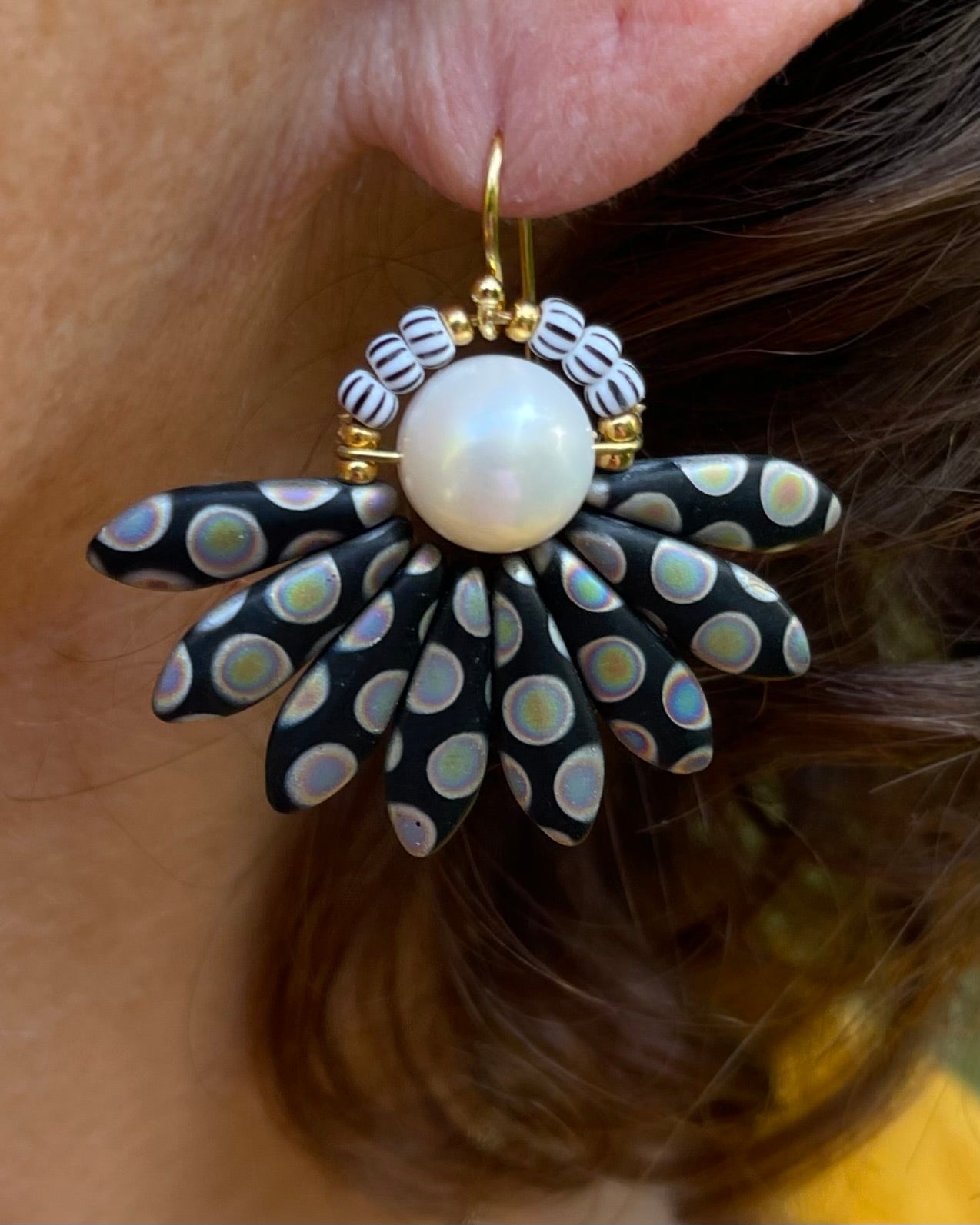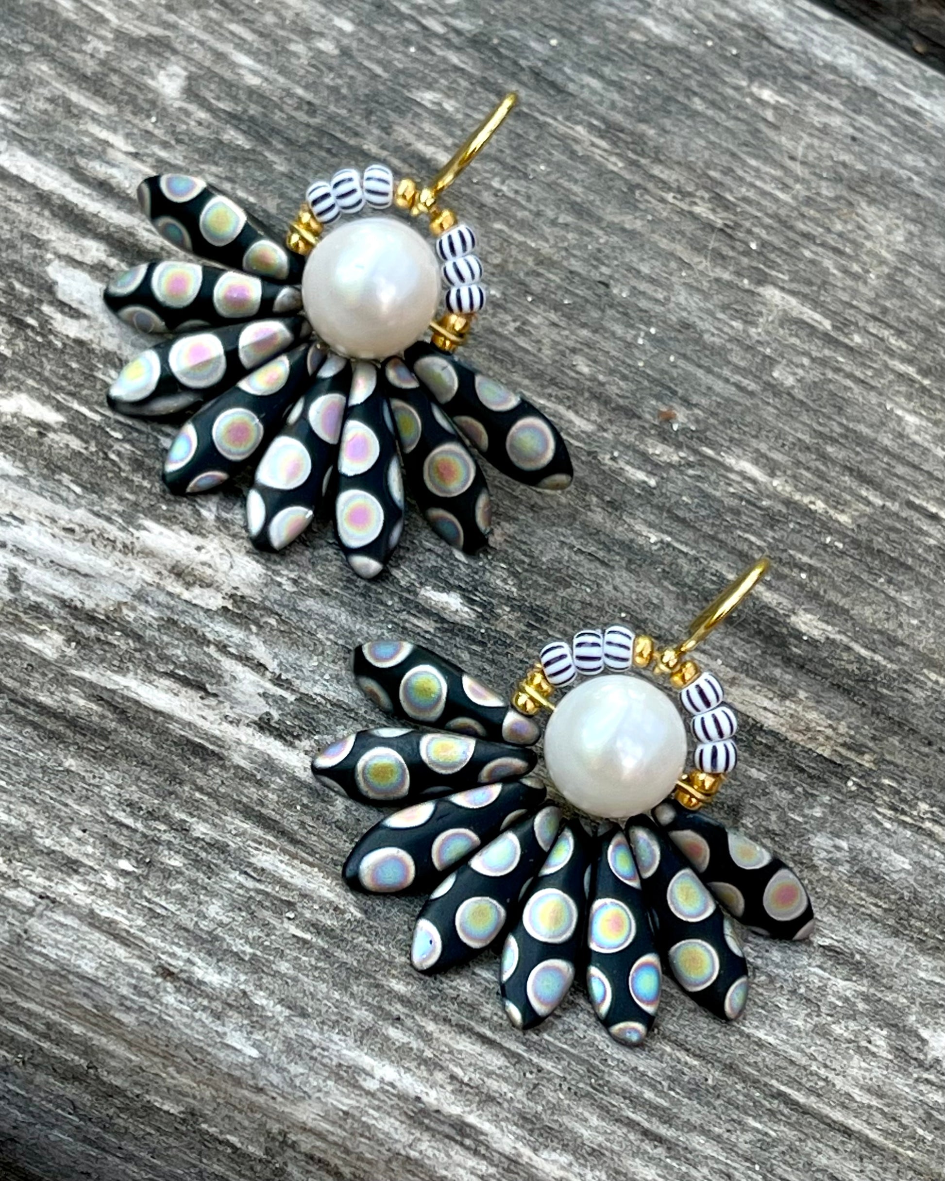 Stor sort og multifarvet blomster ørering med ferskvandsperle. Øreringen består af en flot ferskvandsperle i midten med blade af tjekkiske sorte og multifarvede glasperler og stribede seed beads perler. Ørekrog af forgyldt sølv.