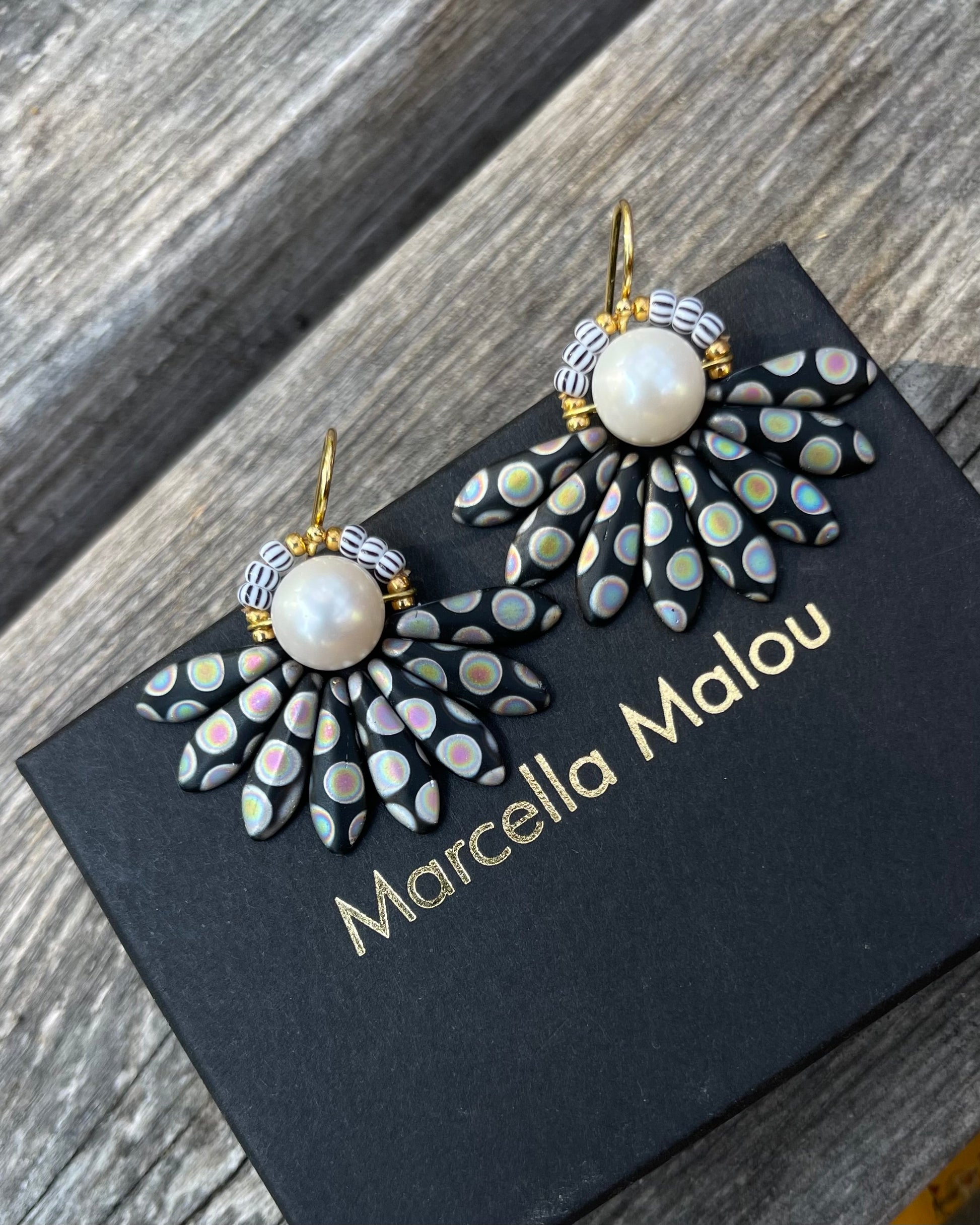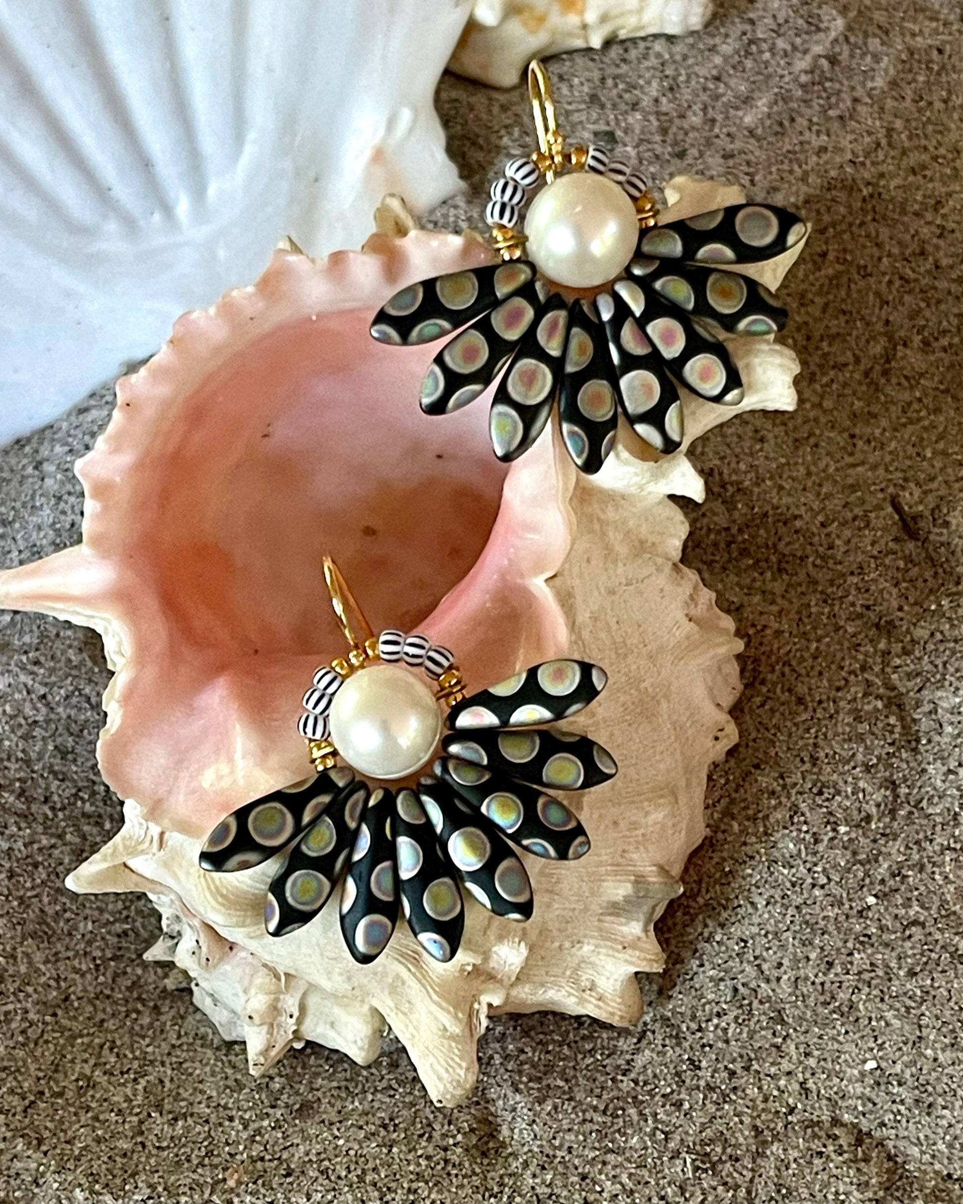 Stor sort og multifarvet blomster ørering med ferskvandsperle
